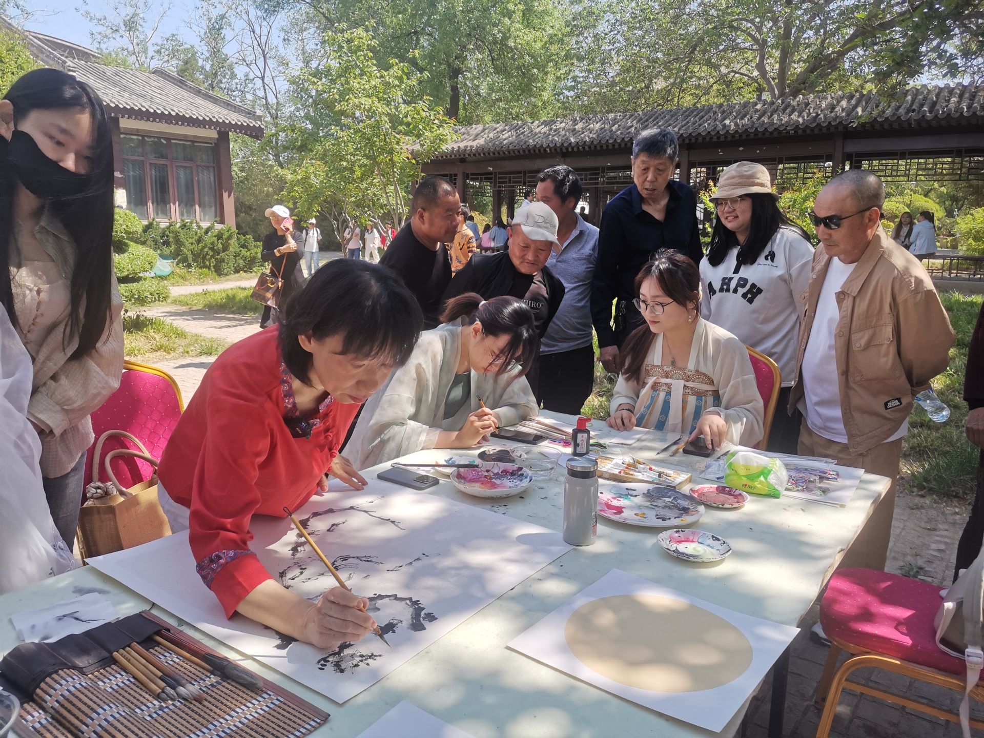 为庆祝“五一”劳动节,弘扬传统文化,5月1日,水上公园联合beat365官网艺术学院、南开区归国华侨联合会,在境界颂艺艺术馆及盆景园举办“劳动之美·园林雅趣”主题书画创作暨汉服文化展示活动。艺术学院庄雪阳老师携学生现场即兴挥毫,以水墨丹青讴歌劳动精神,市民游客在园林雅境中沉浸体验传统艺术与现代审美的交融。