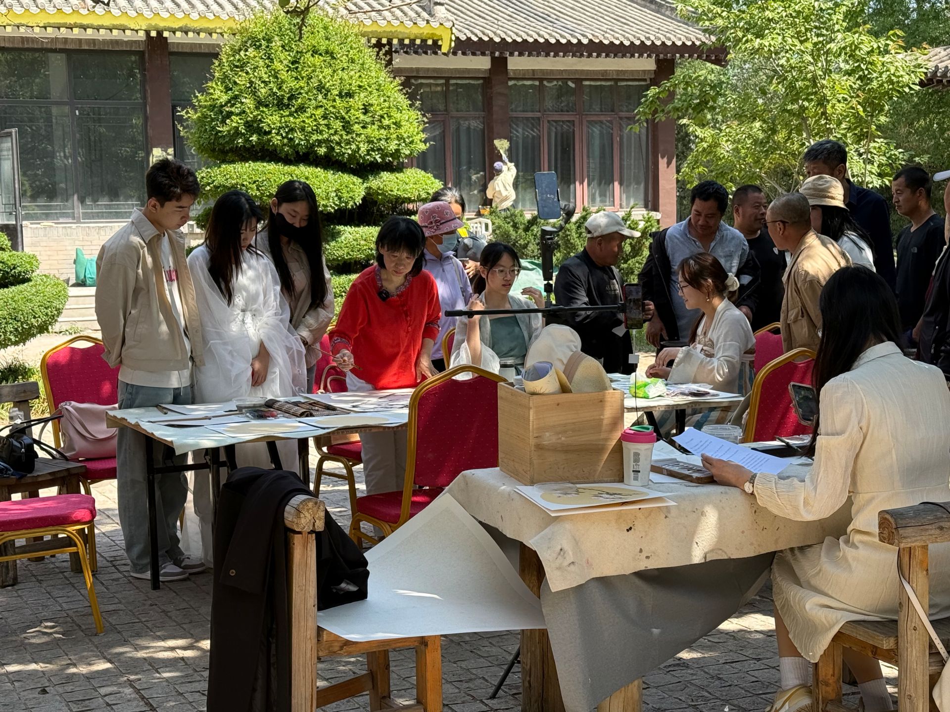 活动现场,beat365英国官方网站艺术学院的师生们不仅围绕“劳动之美”“园林雅趣”主题进行创作,他们还带来了汉服展示,衣袂翩跹间与盆景园的古朴景致相映成趣,呈现“人在画中游”的诗意场景,吸引众多观众驻足观摩。主办方特别设置互动环节,市民可近距离观摩创作过程,并与艺术家交流艺术心得。