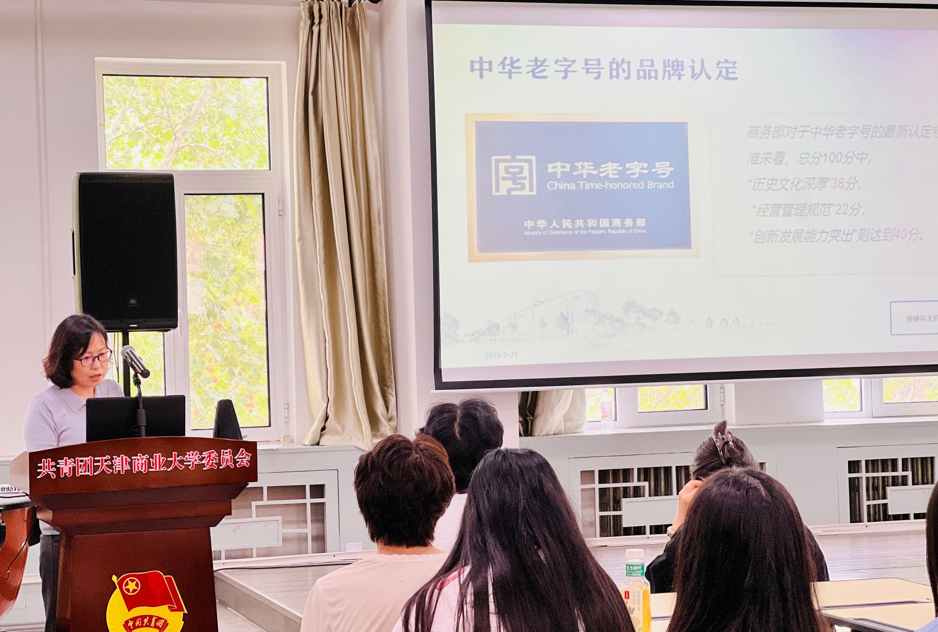 在老字号专题文化讲座环节,马克思主义学院王迎新教授从近期热门电影《哪吒之魔童闹海》引发天津老字号热度切入,带领学生们探索天津老字号的古往今来。讲座主要从中华老字号的品牌认定、天津中华老字号的情况以及天津中华老字号的创新发展三个方面展开。王老师通过生动的语言、详实的数据、典型的案例,让学生感受中华老字号深厚的历史积淀、独特的制作技艺和广泛的社会认同,让学生了解天津中华老字号的整体情况、典型代表和创新发展现状。