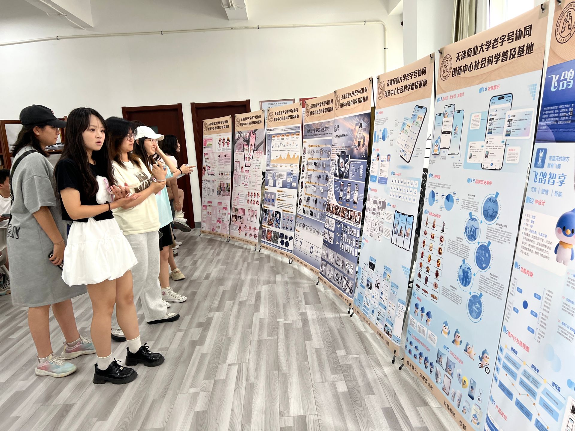 活动结束后,学生们参观了老字号APP设计展。此次展出的飞鸽、海鸥、郁美净三大天津老字号品牌APP案例,均出自校级课程思政示范课《用户体验设计》。APP将老字号的工匠精神和文化基因转化为可交互、可感知的数字化内容,体现了人工智能技术与传统文化深度融合。项目组成员在现场为观众讲解老字号文化传承,并演示用AI工具将数据转化为数字设计语言的过程。这种 “文化解码+科技赋能” 的实践模式,将老字号文化变身易懂的科普资源。