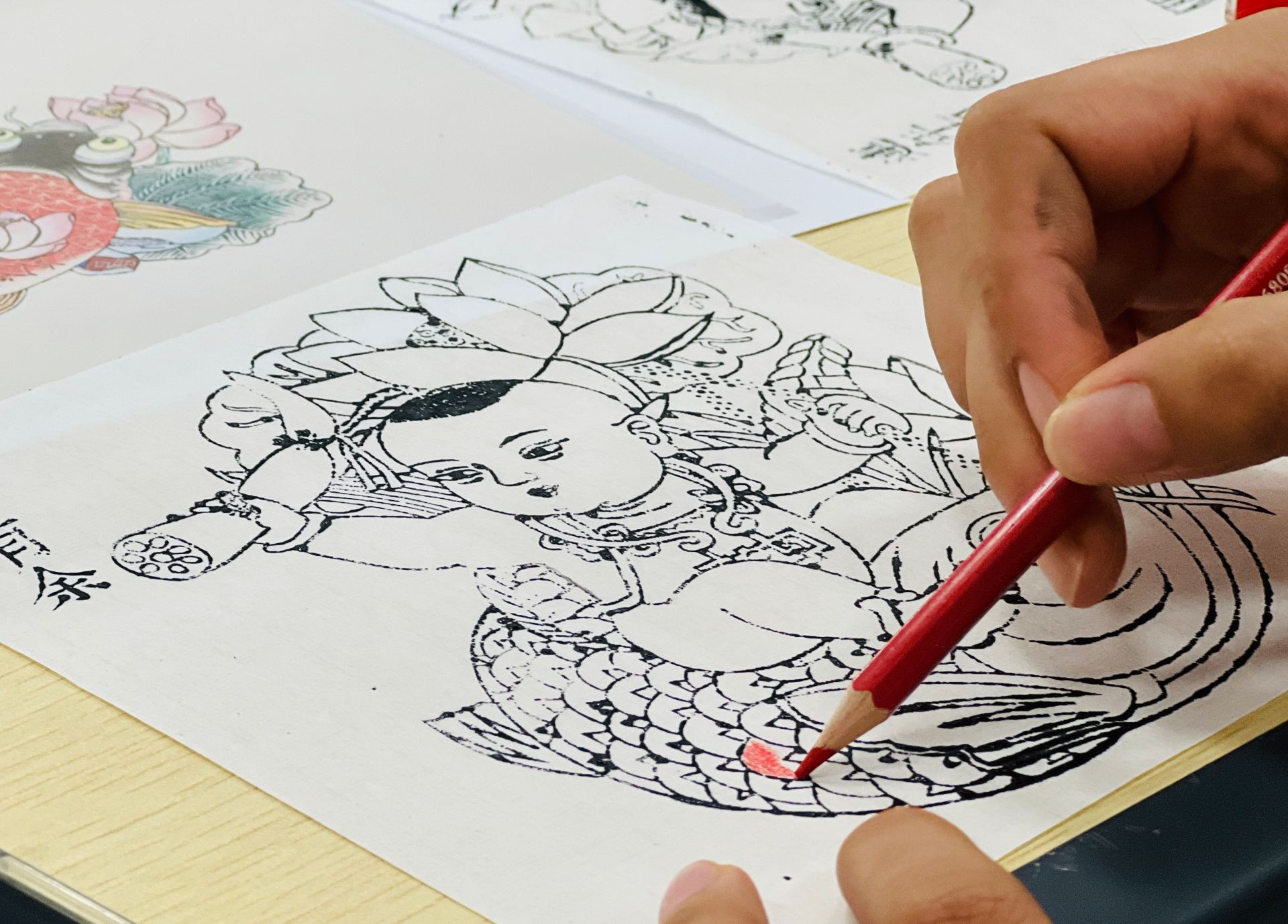 在彩色上色时,学生们手握画笔,以红、绿、黄等传统色彩为年画注入生机。从人物衣饰到背景纹样,每一笔都细致勾勒。当单调的线条被缤纷色彩填满,年画中孩童的笑脸、喜庆的场景跃然纸上,大家真切感受到杨柳青年画“妙在点染”的艺术精髓。
