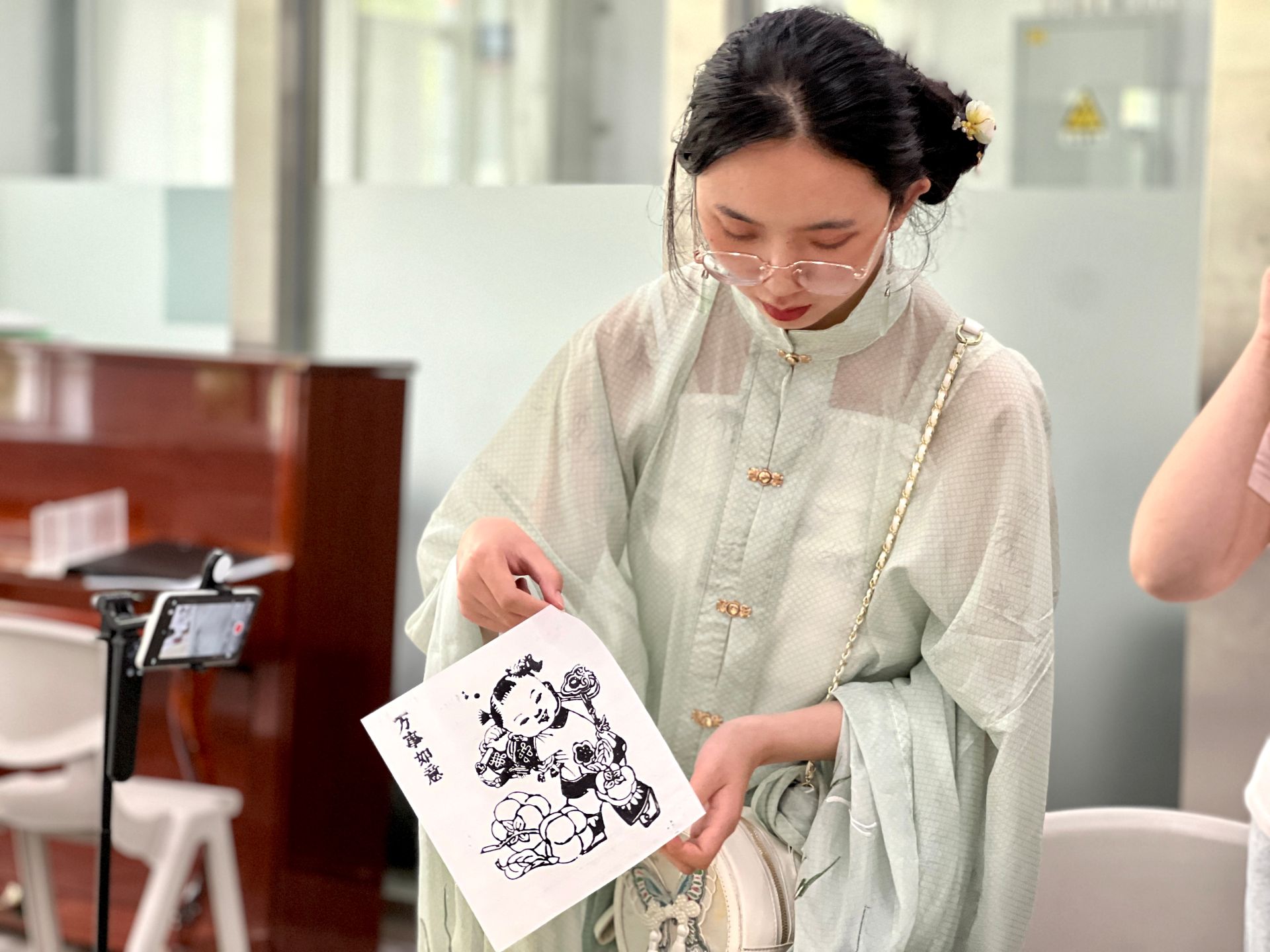 在老字号文化互动式体验环节。艺术学院李云松校友、李颖老师带领学生解锁杨柳青年画传统技艺,沉浸式体验中华老字号文化魅力。在老师们的指导下,学生们率先尝试木板拓印。古朴的雕版上,精致纹样暗藏百年技艺密码。随着宣纸与木板的轻轻贴合、按压,一幅幅年画线条稿逐渐清晰,传统印刷工艺的奇妙令大家惊叹不已。
