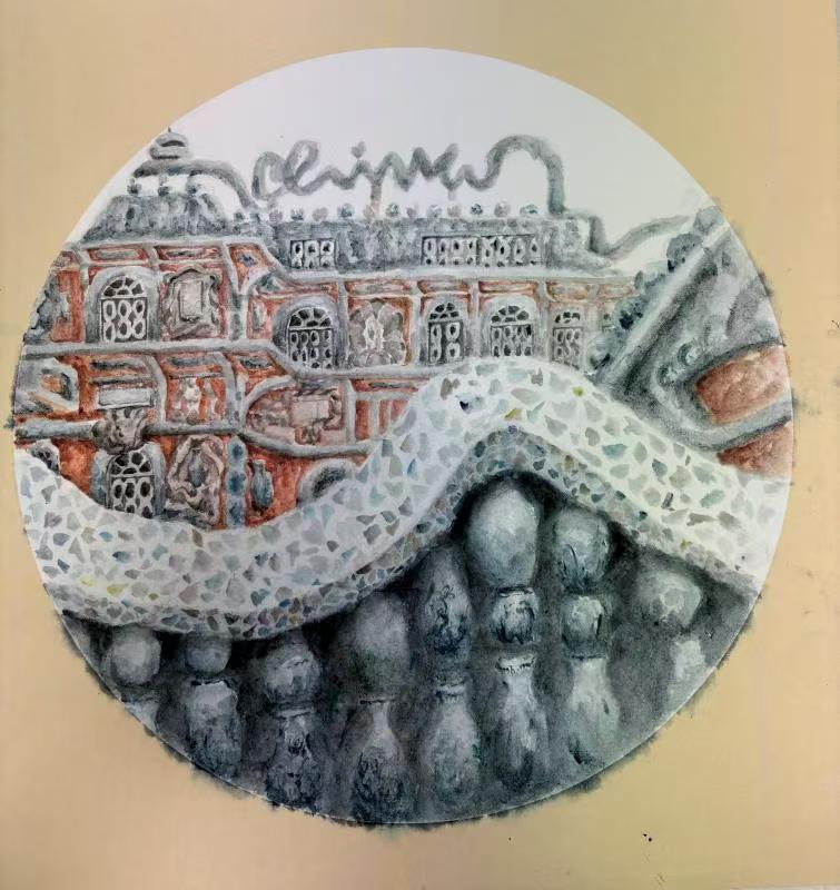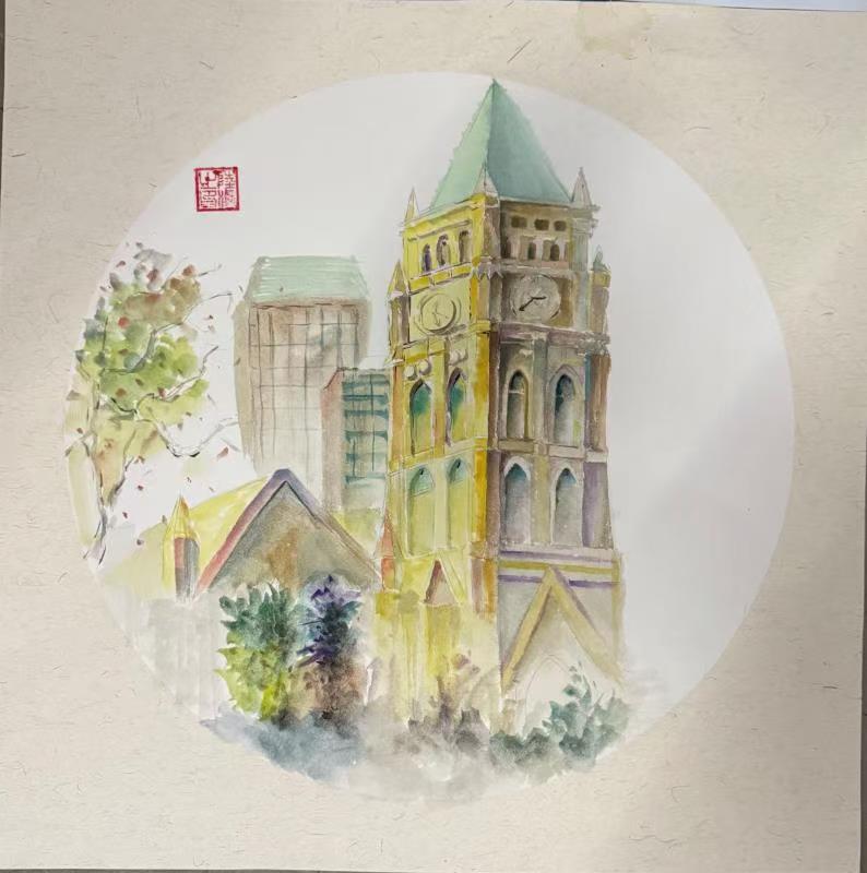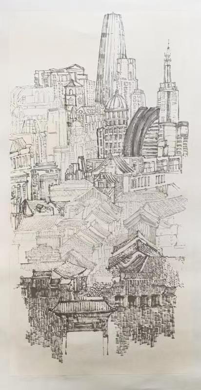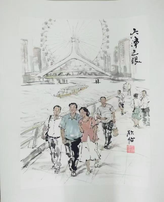 同学们在充分调研的基础上,选取天津具有代表性的景色进行创作,天津之眼、意式风情区、五大道等地标建筑,都成为他们笔下的素材。在技法上,同学们巧妙地将传统国画的笔墨技法创造性转化,创新性发展,同时融入现代审美,用水墨丹青勾勒出天津的古今交融之美,使画面既有历史厚重感,又不失新时代的活力。