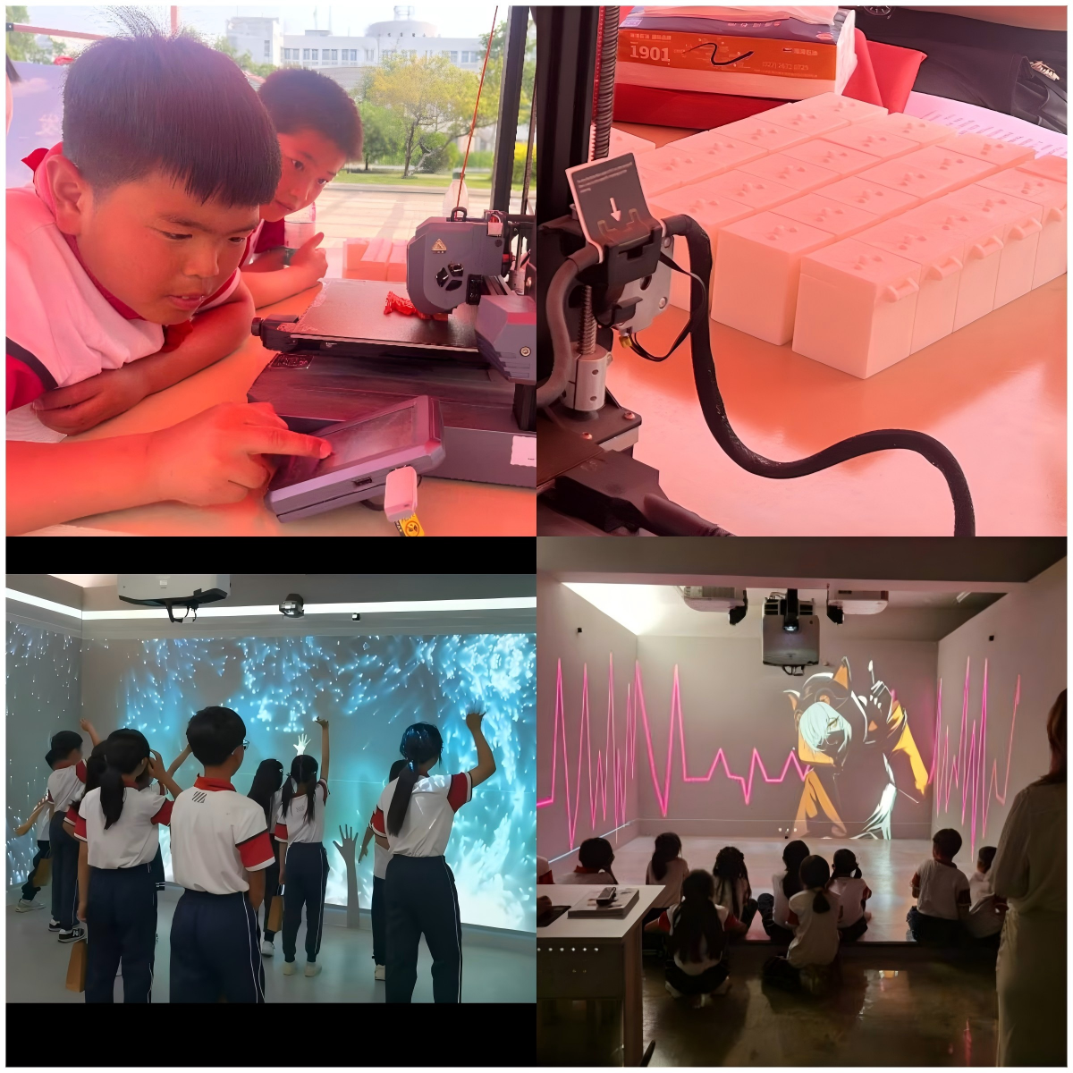 活动最后,现场观看3D打印,并将工业设计专业学生设计且通过3D打印的废旧电池存放盒作为礼物公益发放,旨在培养青少年在日常生活中将废旧的电池盒专门存放和处理的好习惯。此外,还带领小学生到学院二楼投影交互实验室体验数字交互技术,借此展现现代智能制造技术,体现科技的发展进步及其应用,激发青少年对科学技术的追求和热爱。