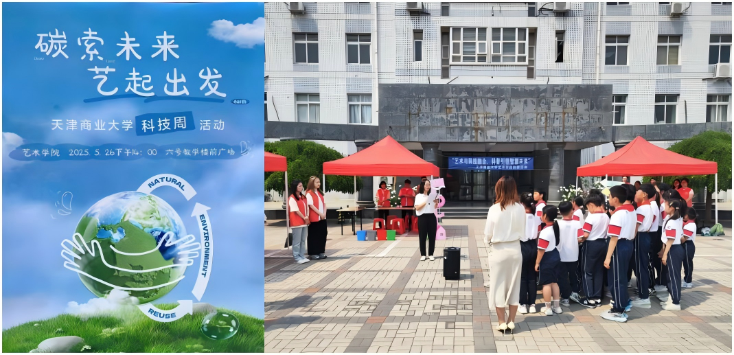 为迎接6月5日世界环保日,正值beat365官网科技周活动开展期间,5月26日,艺术学院在六号教学楼前广场举办主题为“碳索未来,艺起出发”的科普宣传活动。活动聚焦低碳知识和低碳生活理念进行科普宣传,北辰区金艺小学的师生代表参加活动。