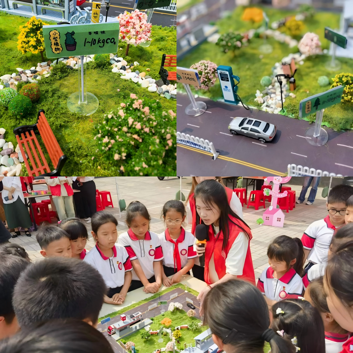 接下来以环境设计专业学生制作的城市沙盘模型作为整体展示,对不同交通工具的碳排放知识以直观的方式进行呈现;同时结合植物花卉,科普碳汇技术和知识。此外,对于碳排放的危害,绘画专业学生以故事形式手绘并设计制作成明信片进行宣传,这一形式受到了小学生们的喜爱。