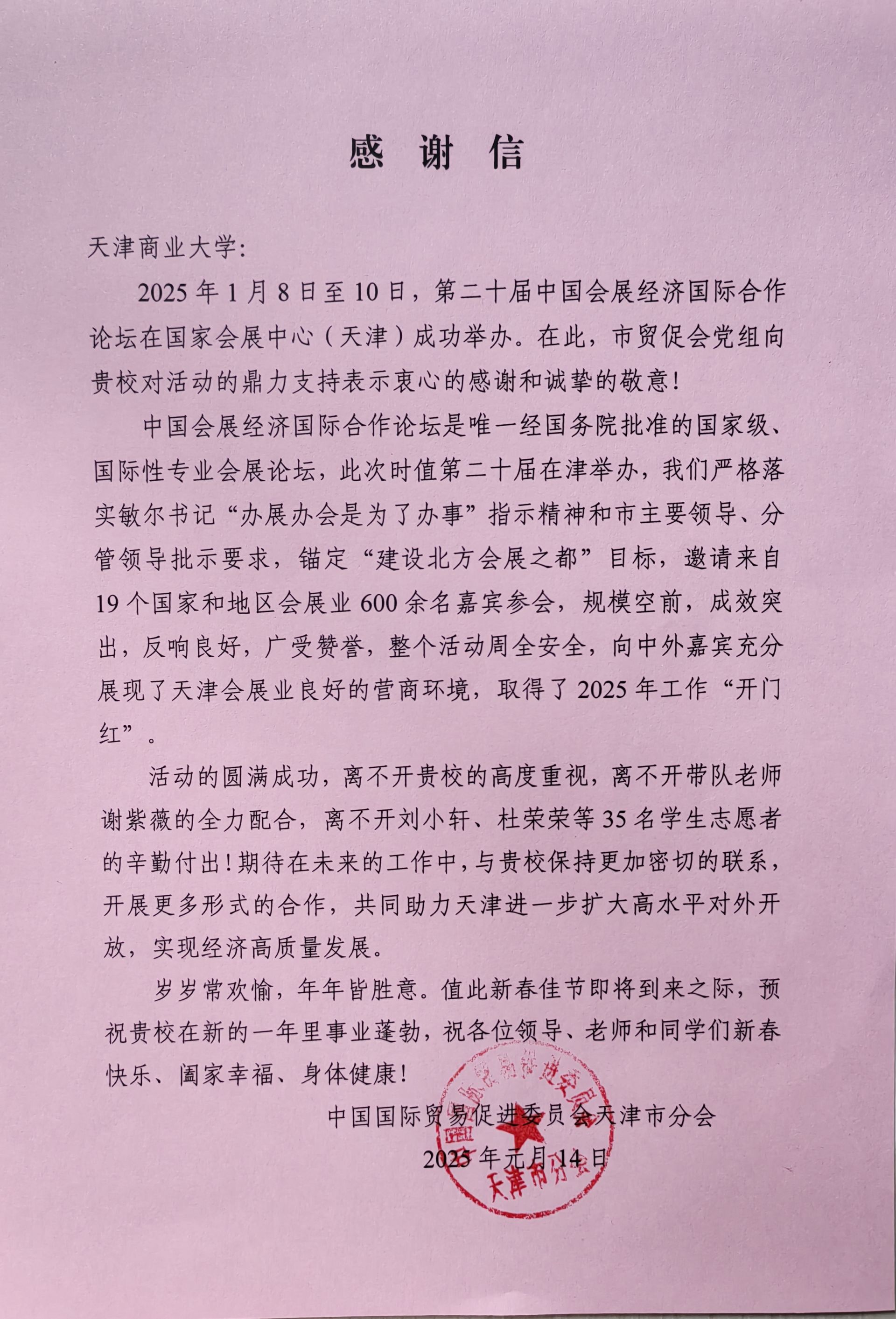 第二十届中国会展经济国际合作论坛以“聚新质生产力,谋可持续未来”为主题,汇聚了来自19个国家和地区的500余位会展业精英。外国语学院精心选拔的35名学生志愿者队伍在天津贸促会主办的多个国际性会议与展览活动中负责翻译、接待与沟通的任务。凭借扎实的语言功底、专业的服务态度以及强烈的责任心,志愿者们为活动的顺利进行提供了坚实的语言保障,赢得了国内外嘉宾的一致好评。