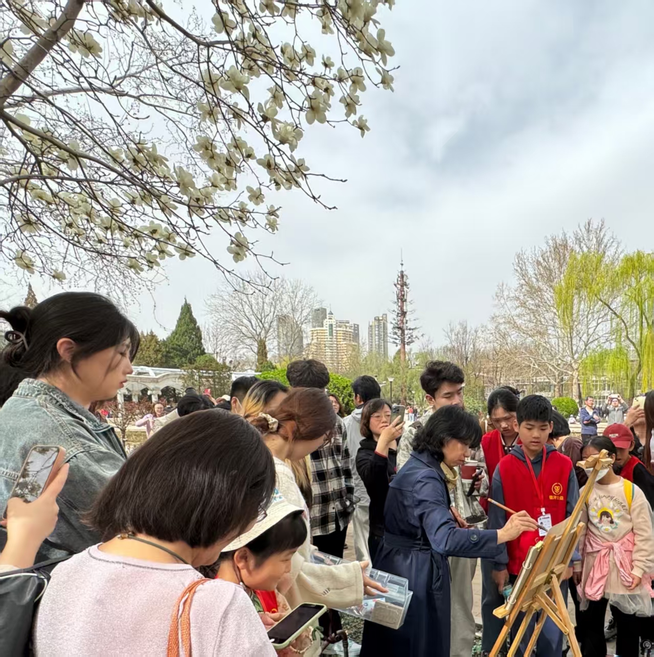 艺术学院庄雪阳老师受邀出席了本次活动,并带领学生做了现场玉兰花写生示范,还对速写天津团队的成员的写生作品进行现场点评。大家互相切磋绘画经验、分享创作思路,在交流中不断碰撞出了更多的艺术火花和创作灵感。