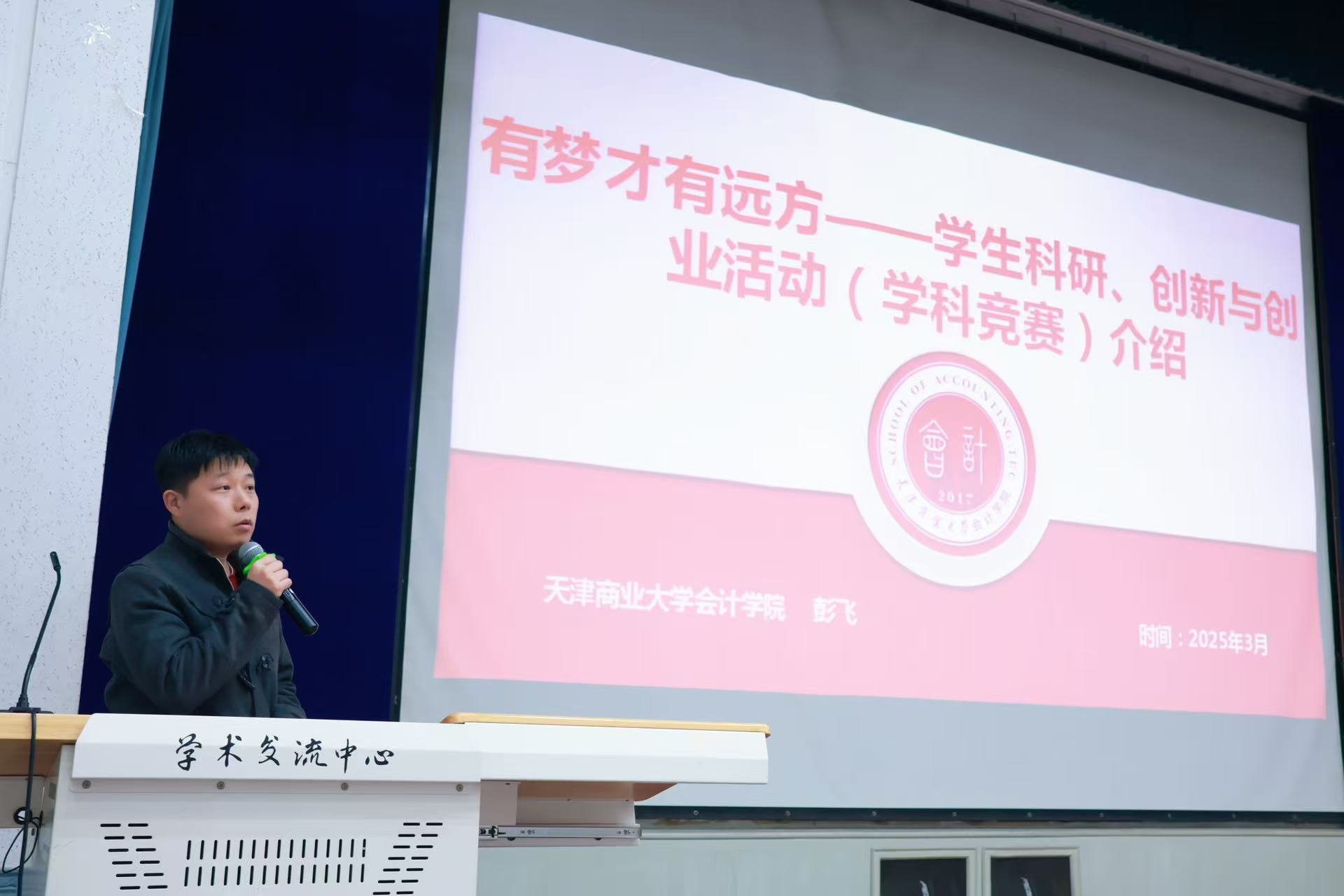 财务管理系系主任彭飞作专题讲座,在学生科研、学科竞赛和创新创业等领域为学生进行详细指导,对财会类专业竞赛进行全面介绍。天津市人民政府奖学金获得者廖文君作经验交流,分享了论文写作学术规范与项目书撰写技巧。院学生会学科竞赛部部长龙若溪作竞赛解读,对2025年全国学科竞赛榜单赛的整体情况与注意事项进行详细介绍。