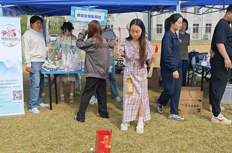 南区操场主会场设置三大互动区域:社团文化展示区、创意手印打卡区及抽奖区,各学生社团通过文创产品、体现社团特色的互动游戏彰显文化魅力:书画协会的“翰墨留香”现场书法创作、国学社的“礼乐投壶”体验、民俗文化弘扬社的“非遗知多少”互动游戏,让传统文化焕发新活力;魔术社的“魔法奇缘”近景表演、弈趣棋社的“智慧对弈”擂台赛、摄影协会的“最美笑脸”即时拍摄,展现现代社团的创新魅力;退伍军人之家社团设计的国防知识问答,将爱国主义教育融入趣味互动。参与师生在各具特色的文化互动中感受丰富多彩的校园文化,经现场师生投票,最终退伍军人之家、国旗护卫队及羽毛球社获评“最佳人气社团”,羽毛球社同时荣获“最佳组织奖”。