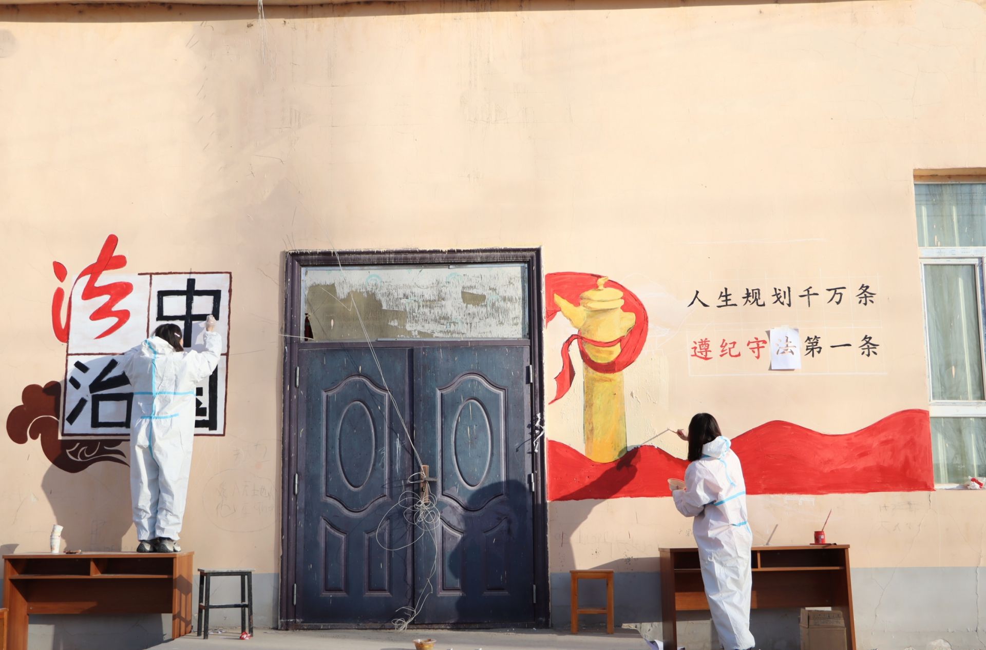 支教团成员走出校园,深入阿热勒乡拉依喀村开展“送法下乡暖民心,法治阳光照乡村”墙绘志愿服务活动。他们利用自身特长,为乡村的墙壁绘制了一幅幅生动的法治宣传画。这些墙绘以简洁明了的语言和栩栩如生的画面,向村民们普及了宪法、民法典等法律知识,营造了浓厚的法治氛围,有力推动当地村民学法尊法守法用法的良好风气,为乡村法治建设注入新活力。