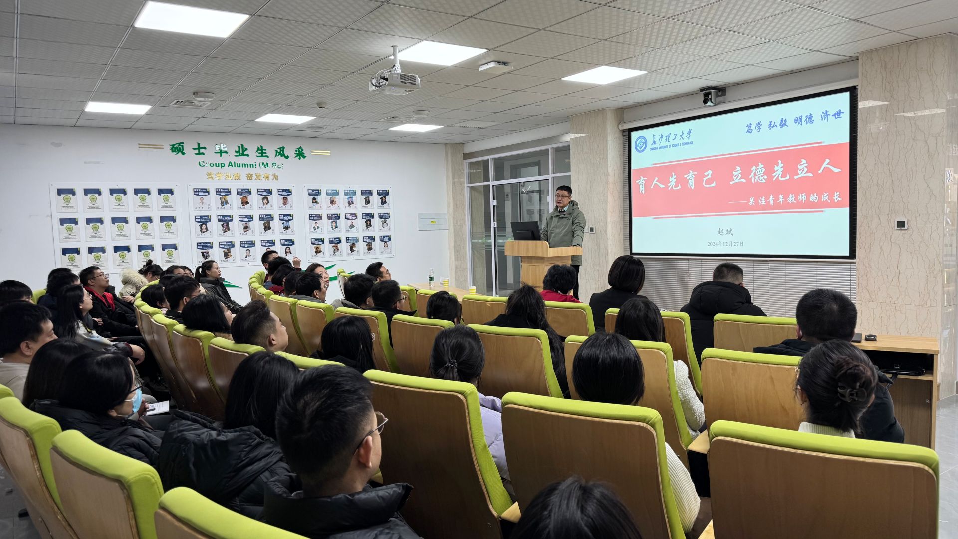 12月27日下午,机械工程学院在一号实验楼313会议室举办主题为“育人先育己,立德先立人”的专题讲座。本次讲座特邀长沙理工大学教授、电气工程学科博士生导师赵斌作为主讲人,学院党委书记张莹、院长刘圣春、党委副书记王珊,及近五年新入职教师、全体辅导员60余人参加。讲座由机械工程学院院长刘圣春主持。