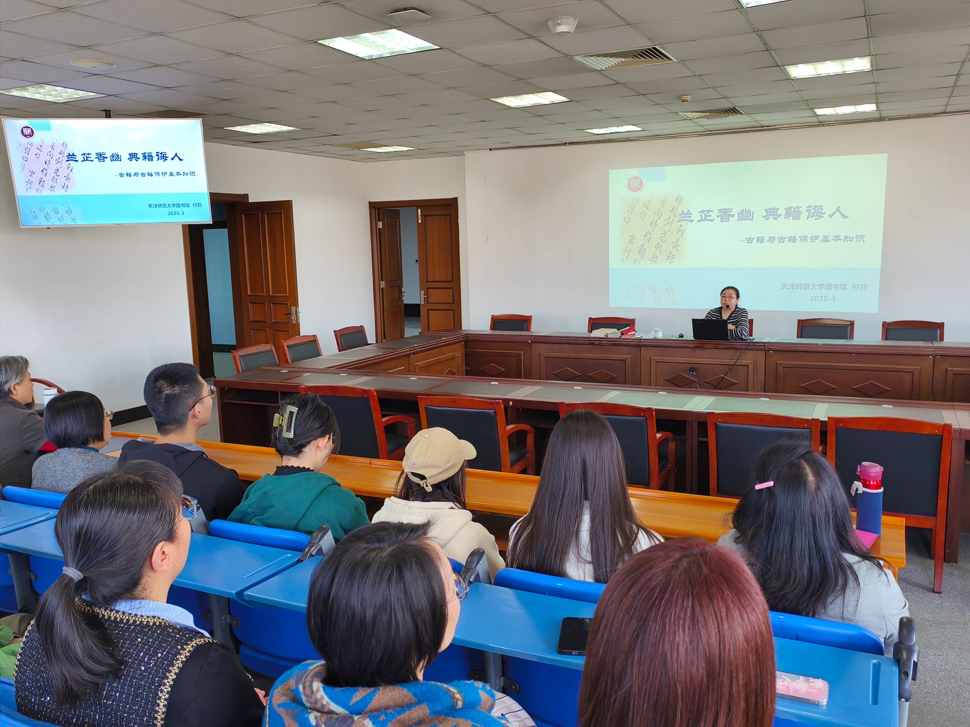 随后,天津师范大学图书馆古籍特藏部主任付莉在弘毅厅以“兰芷香幽,典籍诲人—古籍与古籍保护基本知识”为主题开展专题讲座。付莉主任围绕古籍的版本形式、装帧艺术、保护技术工作相关标准及古籍纸张四个方面展开,深入浅出地介绍了古籍保护的基本知识,并通过不同版本的古籍、修复工具等实物展示,让大家直观了解书籍发展的历程,对古籍保护有了新的认识。