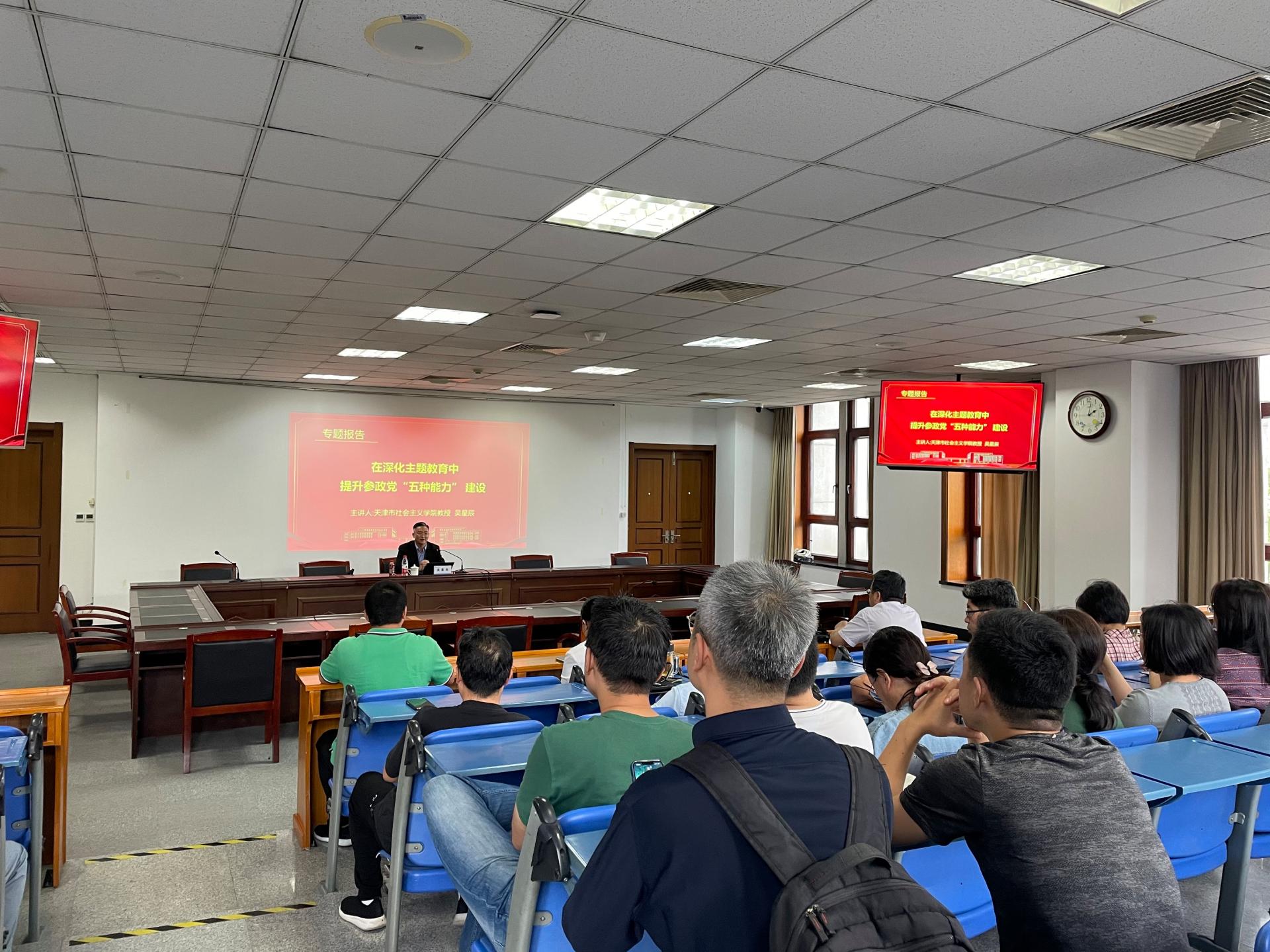 9月25日,学校举办党外人士履职能力建设专题培训讲座。天津市社会主义学院统一战线理论研究中心执行主任吴星辰教授作以“在深化主题教育中提升参政党‘五种能力’建设”为题的辅导报告。各民主党派、知联会成员、无党派人士参加。