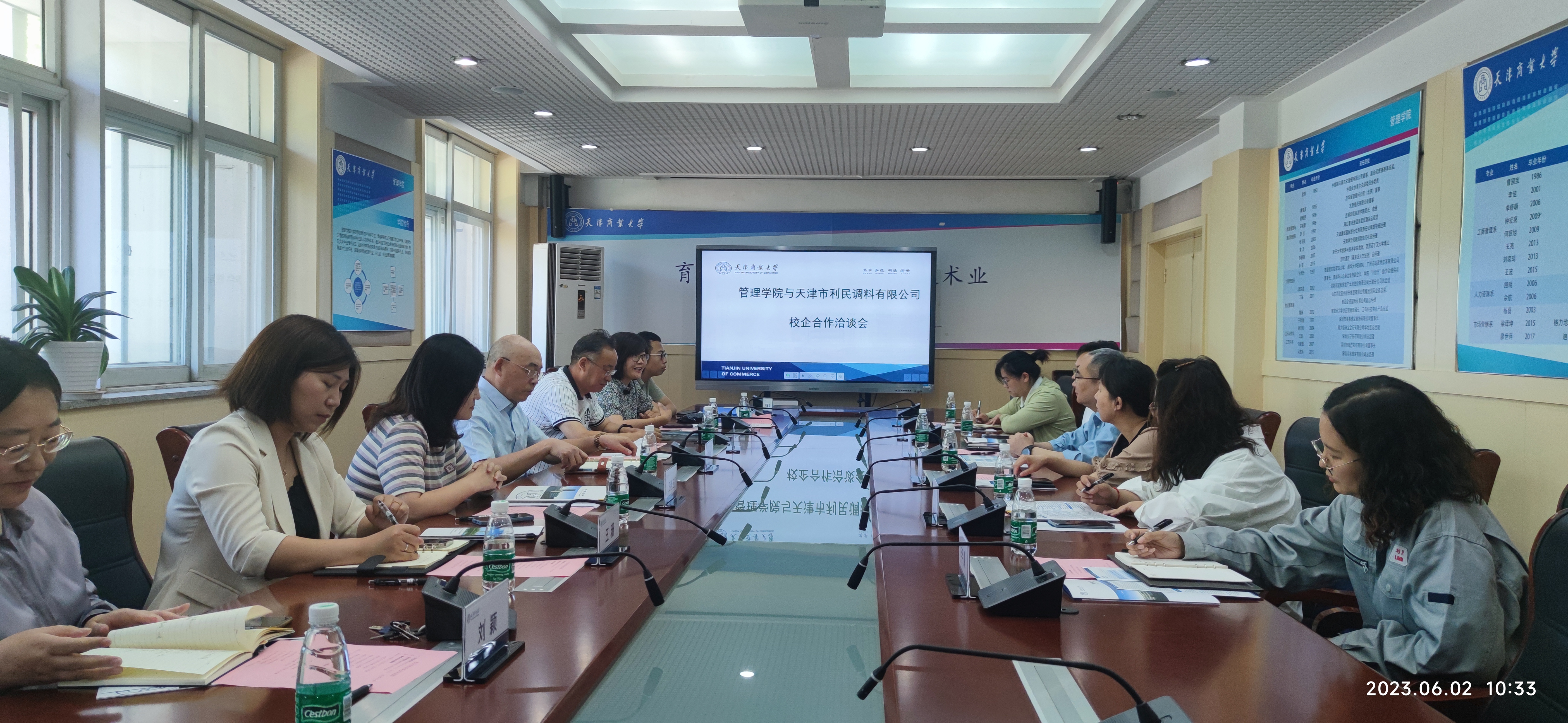 6月2日上午,beat365英国官方网站管理学院与天津市利民调料有限公司校企合作洽谈会在管理学院210会议室召开。天津市利民调料有限公司党委书记、董事长程鹏,副总经理冯树涛,纪检书记张樱樱,市场部部长刘少玥,人力资源部部长浦香玮参会,管理学院党委书记庞文生、院长王庆生、党委副书记沈洁、副院长王艳芝、校团委副书记王珊、市场营销系副主任刘颖、工商管理系主任助理孙可远,就业辅导员李秀峰、刘祎康等参加洽谈会。