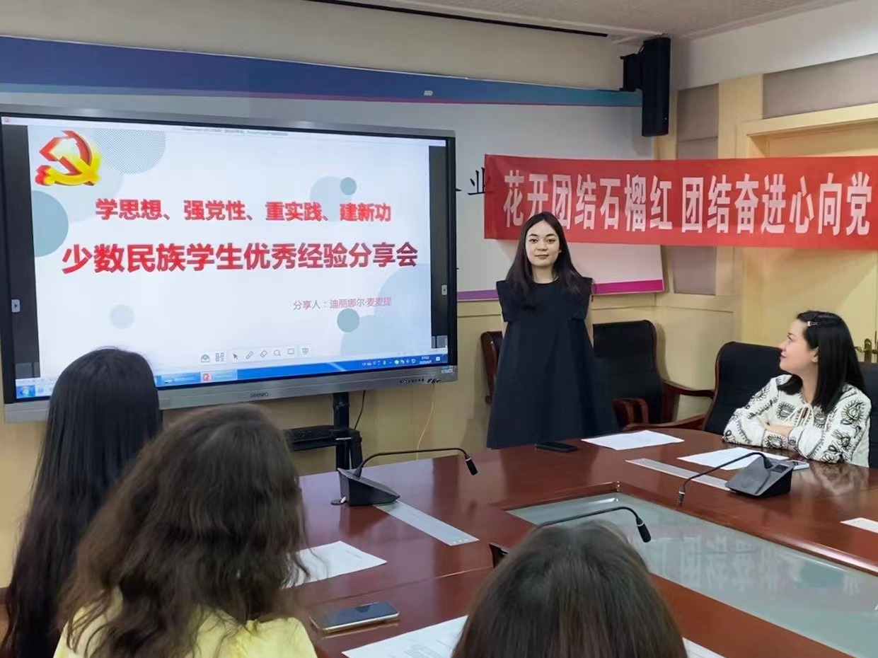 为深入学习贯彻习近平新时代中国特色社会主义思想,推进主题教育走深走实,促进学生成长成才,6月7日,管理学院举办少数民族优秀学生就业、入伍经验分享会,学院2019级宝石与材料工艺学专业学生、入职中国民航大学少数民族辅导员迪丽娜尔·麦麦提,2020级工商管理专业征兵入伍学生开吾沙力丁·买买提作为主讲嘉宾,学院党委副书记沈洁,少数民族专职辅导员娜迪热·艾合买提,2020、2021、2022级本科生代表参加分享会。