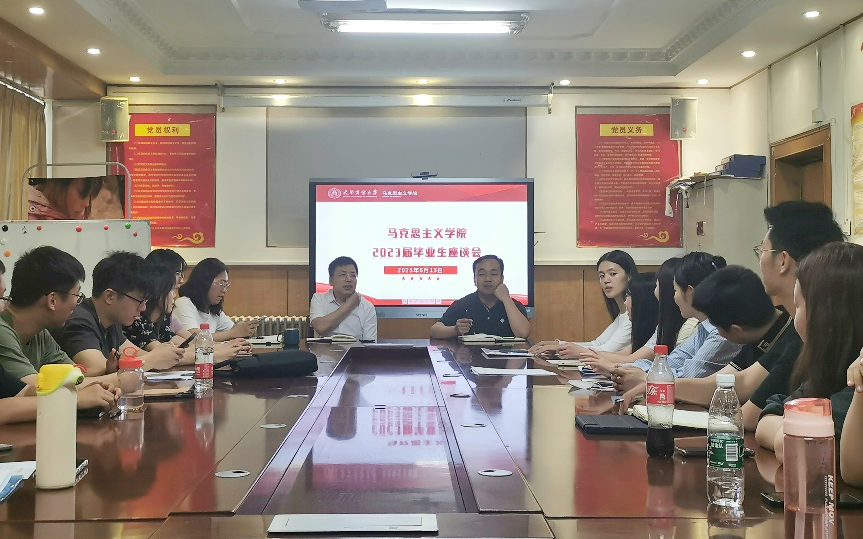 6月15日,马克思主义学院举办毕业生座谈会,学院党委书记刘振强、副院长安晋军、辅导员张晶,与2023届全体毕业生相聚一堂,共叙师生情谊。