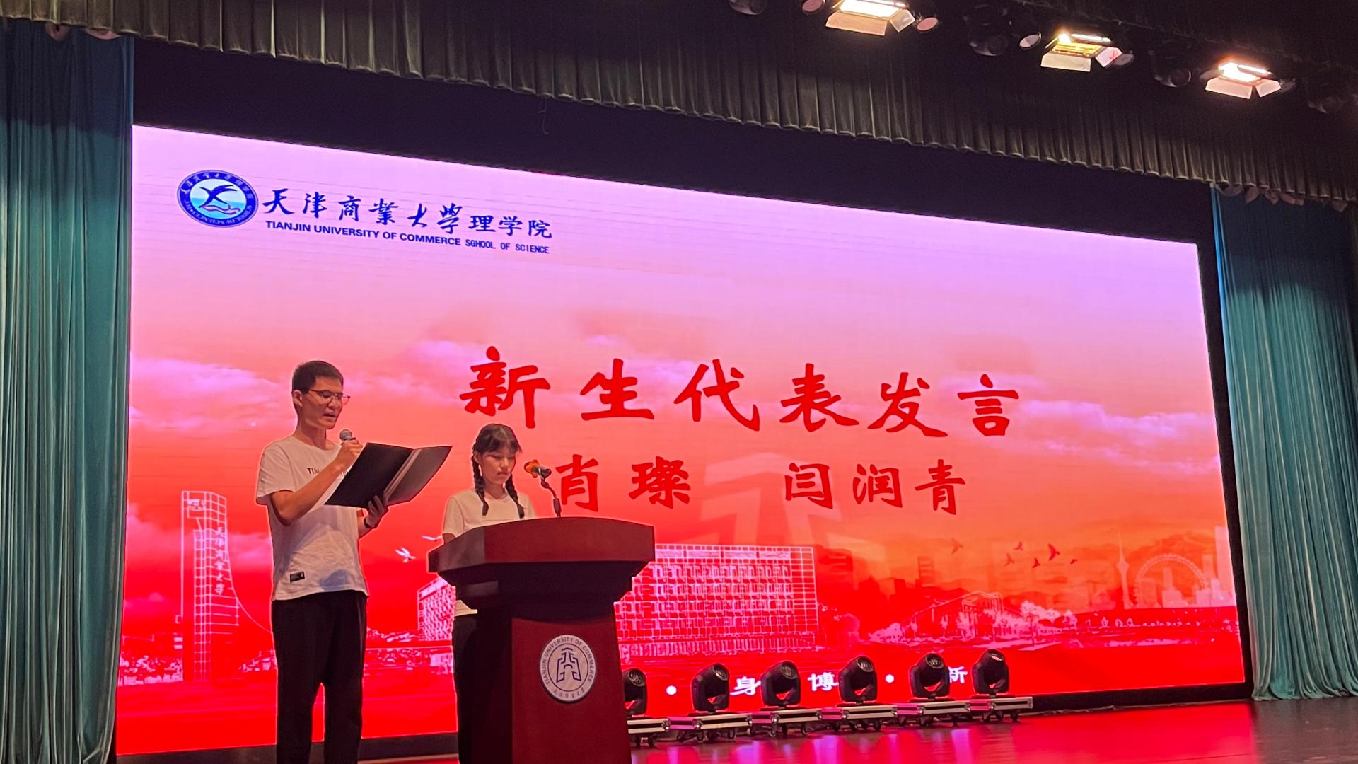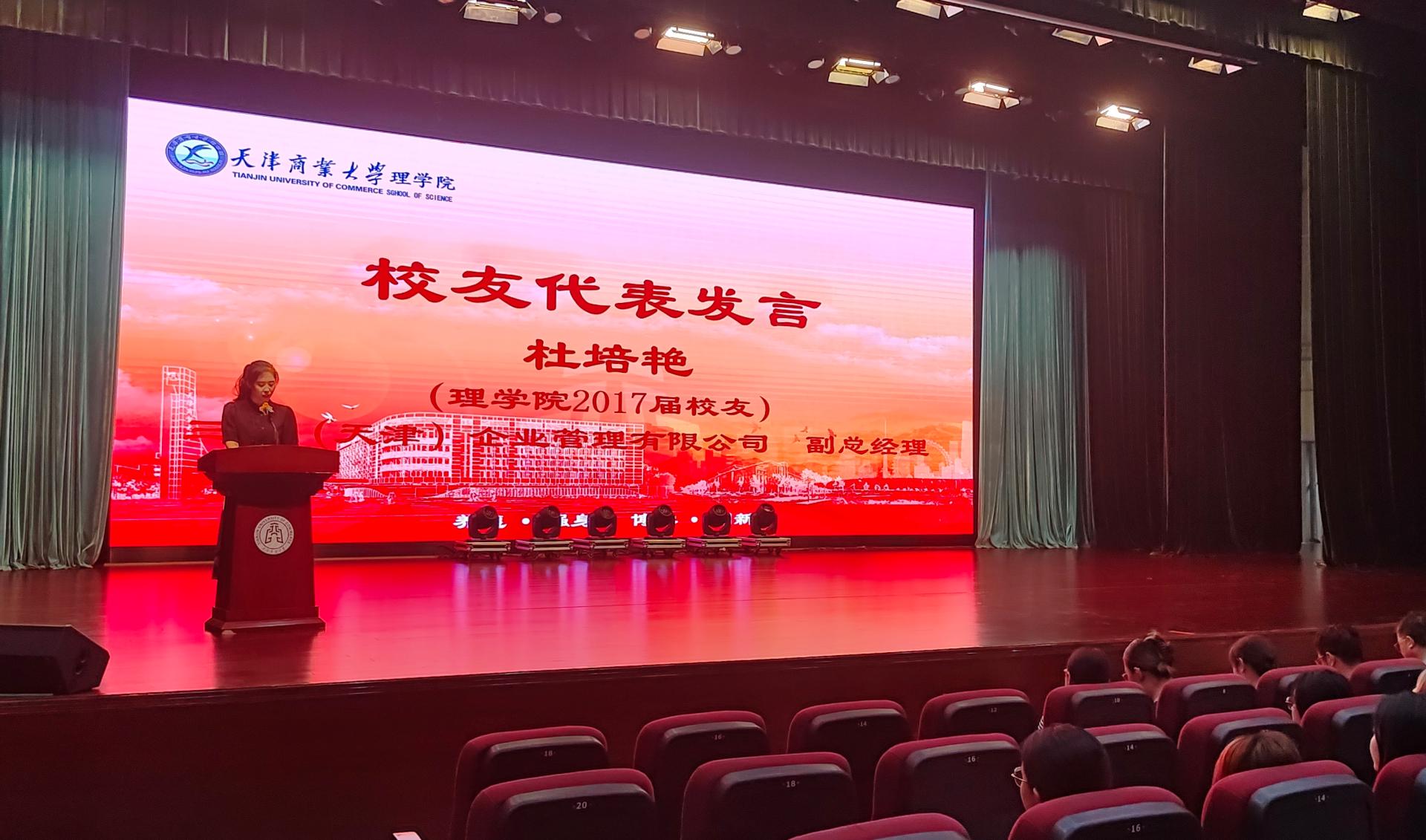 理学院2017届优秀校友、三司(天津)企业管理有限公司副总经理杜培艳作为优秀校友发言,她表示非常高兴以校友代表的身份重回母校,并结合自己的创业历程与学弟学妹分享了自己的感悟。她殷切叮嘱学弟学妹们要牢记并践行“笃学、弘毅、明德、济世”的校训,更要大胆尝试,积极参与各类实践。最后,她希望学弟学妹们能够在天商放飞自己的梦想,展示自己的才华,创造美好的未来。