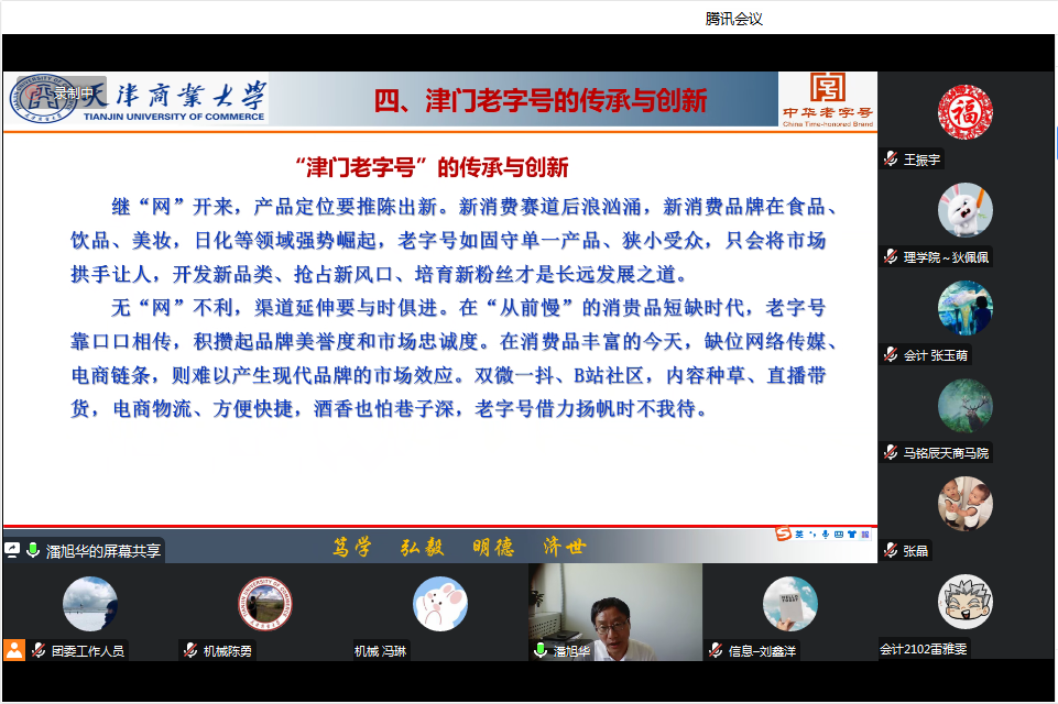 本次培训会特别邀请了教学质量保障中心主任潘旭华教授作以“老字号的传承与创新”为主题的报告。潘教授结合历史典籍、具体事例、详实数据,深入浅出地从字号的由来、老字号的历史、中华老字号的认定规范、津门老字号的传承与发展、暑期社会实践的认知及调查的重点内容等六个方面进行了解读,为接下来实践团到老字号企业中开展实践活动指明方式、开拓思路。2022年国家重点实践团指导老师张晶、学校重点实践团指导老师陈心旗分别结合带队的亲身经验,向与会师生分享了在选题立意、组队实施、成果展示等方面的心得体会。党委宣传部新闻宣传科科长张孟凯详细介绍了实践活动的新闻写作规范及照片、视频的拍摄要求与注意事项。校团委干部刘海东对实践活动材料报送、安全须知、新媒体宣传等工作进行了说明。