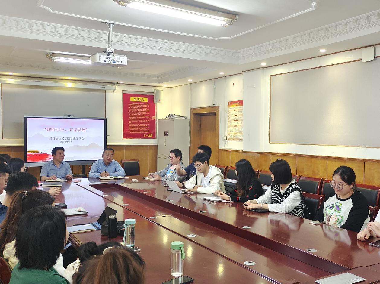 5月8日,马克思主义学院党委扎实推动学习贯彻习近平新时代中国特色社会主义思想主题教育,领导班子深入青年学生开展调研,召开研究生座谈会,解决研究生面临的急难愁盼问题。学院党委书记刘振强、副院长安晋军、教学秘书陈旭、辅导员张晶以及学院全体2022级研究生共30人参会。