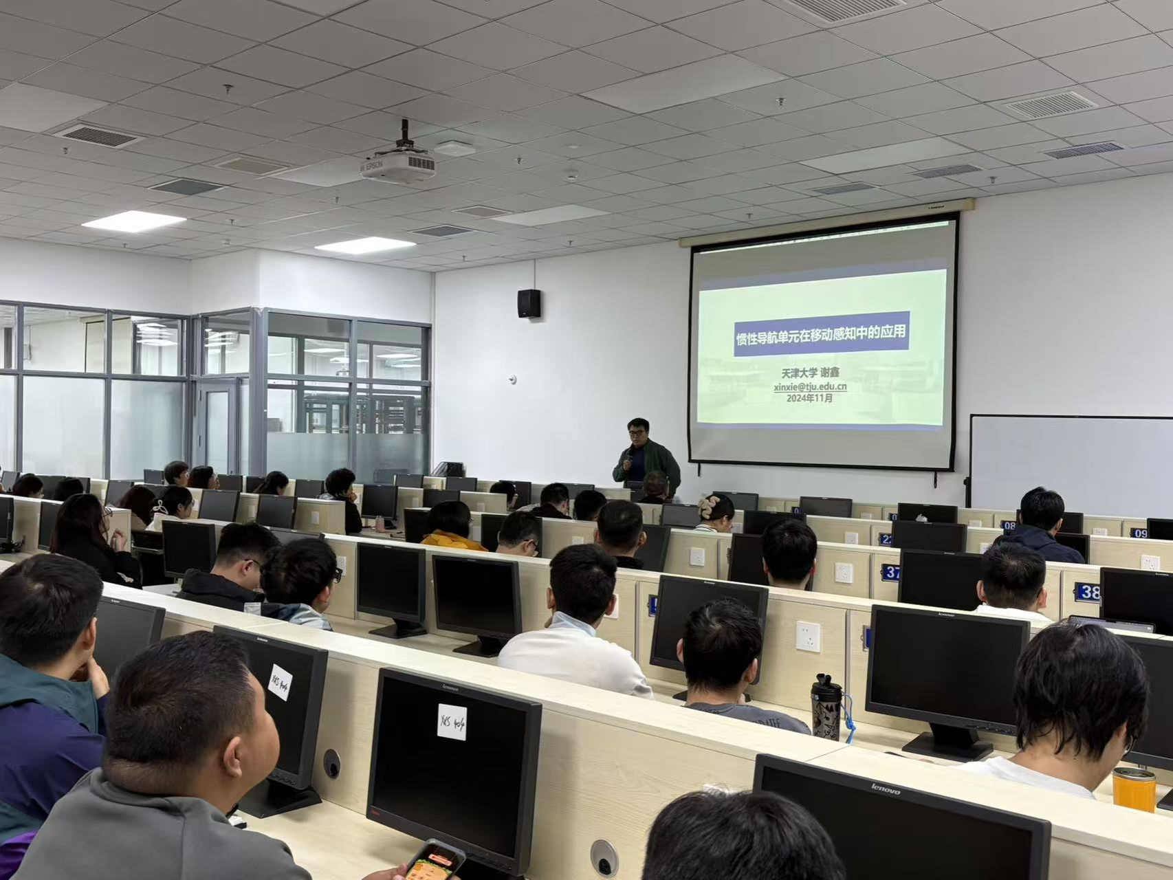 讲座过程中,谢鑫博士以“惯性导航单元在移动感知中的应用”为主题,聚焦“行为感知、位置感知、姿态感知”三个维度展开详细讲解。记录人走的步数一直是一个经典的人体感知问题,谢鑫博士从生活实例出发,从记步器历史到记步器的今天,向师生们讲述了惯性测量单元IMU在日常生活中的广泛应用;接着,从算法评估、位置轨迹、误差估计、姿态识别等方面详细讲解了惯性导航单元在移动感知中的应用;最后,谢鑫博士面向青年教师的职业发展与规划传授了宝贵经验。