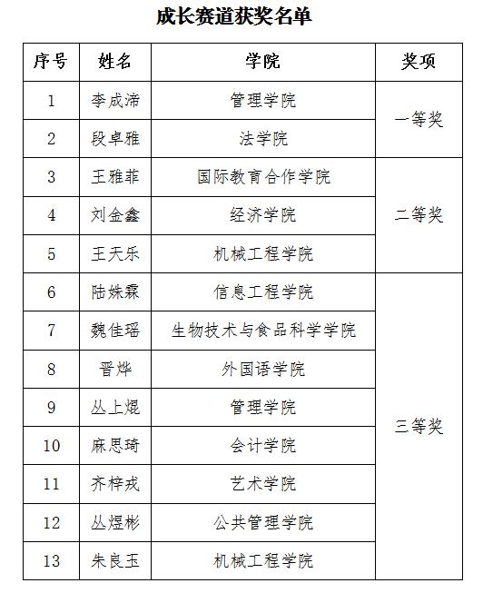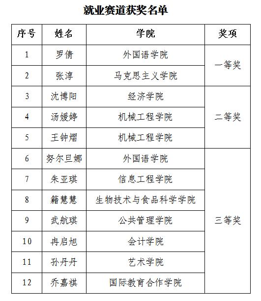 12月11日下午,学校第二届大学生职业规划大赛在七教报告厅举办。经过激烈角逐,管理学院李成渧等4名同学获得一等奖,国际教育合作学院王雅菲等6名同学获得二等奖,信息工程学院陆姝霖等15名同学获得三等奖。