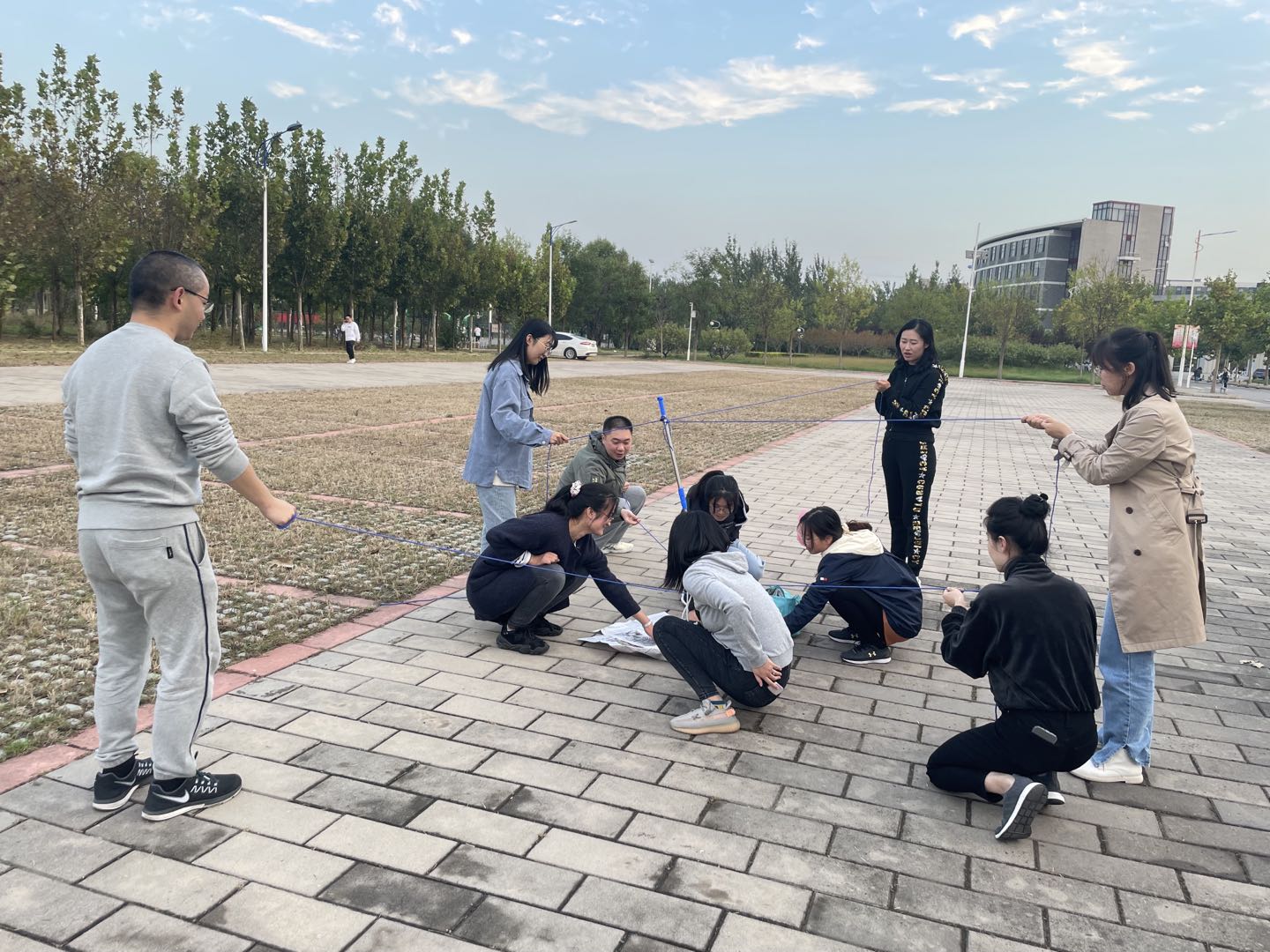 在国家中级拓展培训师的带领下,本次培训开展了团队破冰、急速60秒、神笔马良等项目挑战。“破冰”活动后,新入职教师被分为5个团队,团队中的成员全情投入、积极沟通、互助互信、群策群力,克服困难顺利完成目标任务。在“神笔马良”活动环节,所有参训教师共同书写“天商一家人”,增强了新入职教师加入天商大家庭的荣誉感和使命感。
