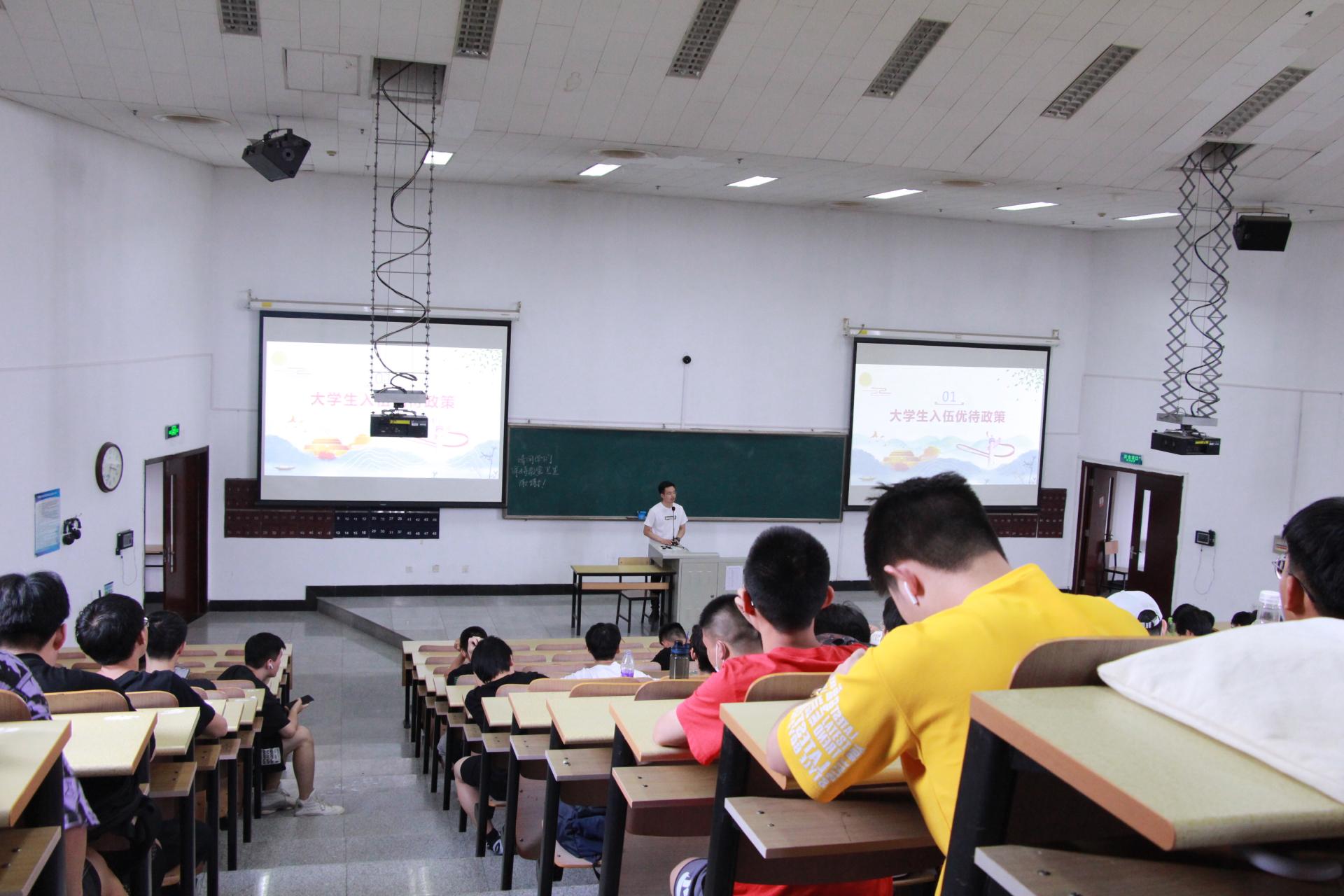 6月23日下午,国际教育合作学院在国际教育交流中心E303召开大学生应征入伍政策宣讲会。学院辅导员以及近200名男生参加。