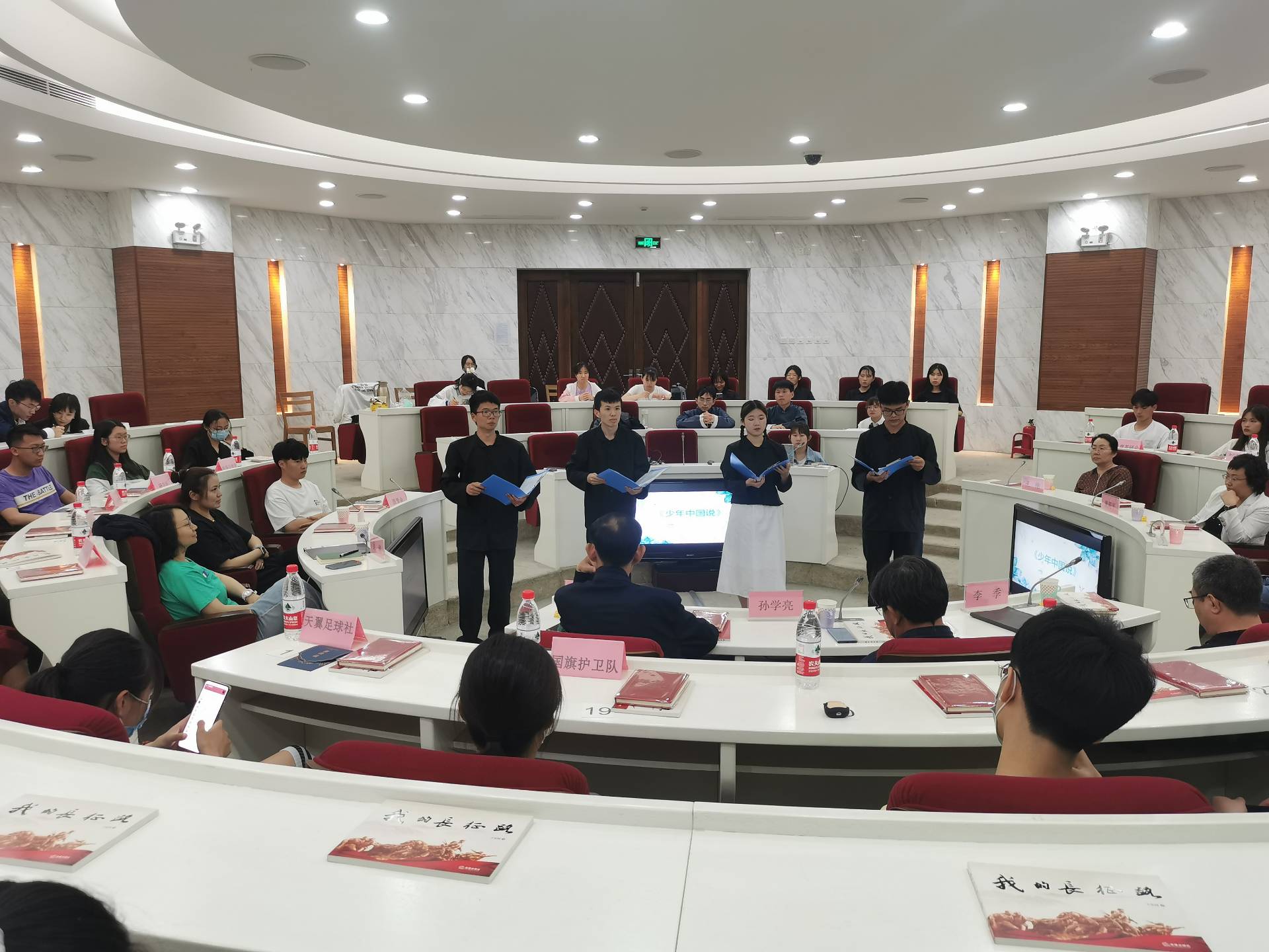 活动中,同学们围绕本次共读书目《为什么是中国》及中国共产党成立以来的伟大成就,进行了多视角的话题讨论。学生表演团队以中共一大为主题,精彩地演绎了在当时国际与国内环境威胁下中国共产党诞生的整个历程。四位与会同学代表随后慷慨激昂地朗诵了《少年中国说》。法学院退休教师邢素军特邀为同学们的朗诵表演进行点评,指导同学们以更加饱满的热情诵读红色经典,更好的传递其中的精神内涵。活动最后,孙学亮馆长及馆员们围绕共读书目、活动意义及同学们的表现分享了自己体会和见解。