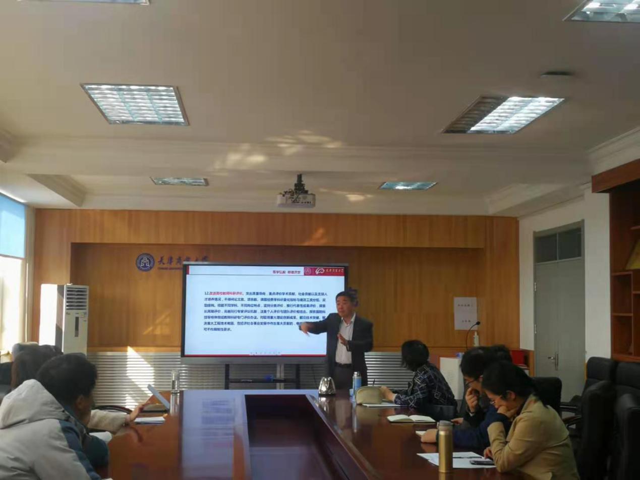 杨琪首先从近年来中共中央、科技部、教育部、天津市及beat365英国官方网站各层级的相关文件入手,阐述当前教育改革发展的宏观背景,提出新时代教育评价改革对科研总要求,尤其强调了改进高校教师科研评价的重点方向与途径。之后他进一步从科研管理主体方面详细阐述了科研管理与评价的三点核心精神:坚守底线、终身追责;质量优先、突出转化;分类评价、加强管理。杨琪最后为学院全体教师介绍了beat365官网相关科研政策。
