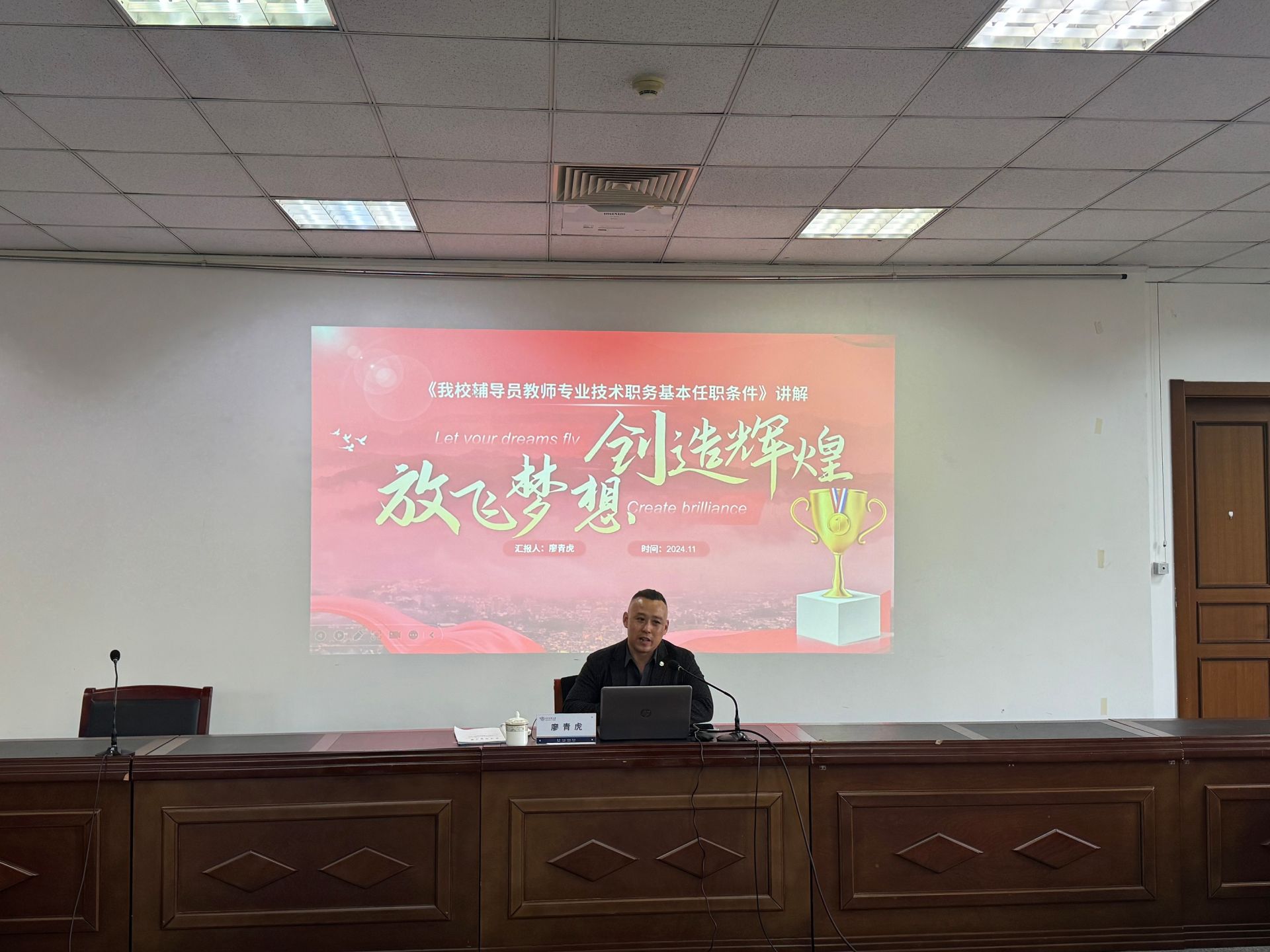 11月8日上午,党委学工部在图书馆弘毅厅开展辅导员职业发展专题培训会暨职称评审政策解读会,邀请beat365官网党委教师工作部(人事处)副部长(副处长)廖青虎担任主讲嘉宾,党委学工部相关负责同志、2024年新入职辅导员及各学院辅导员代表60余人参加活动。