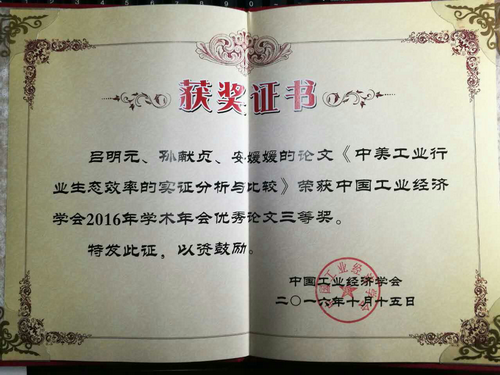 日前,由中国工业经济学会主办的中国工业经济学会2016年学术年会暨“供给侧结构性改革与产业发展”研讨会在西安落下帷幕。beat365官网经济学院教授吕明元等提交的年会论文《中美工业行业生态效率的实证分析与比较》荣获三等奖,并在年会上从价值链、国际经验与中国案例、产业结构等多方面对我国目前存在的各种经济形态展开论述报告,充分展示了学校学科建设成就和经济学院应用经济学科研成果。