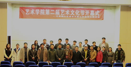 杨震为第二届艺术文化节致开幕辞。开幕式通过播放视频短片对艺术学院首届艺术文化节的各项活动进行了回顾。随后,艺术学院学生会主席吴梦飞宣读第二届艺术文化节倡导书,介绍了第二届艺术文化节将以“艺启践行社会核心价值观”为宗旨,在师生中拟开展“感受艺术之美·启发专业之蒙”艺术讲堂活动;“敬业铸造力量·奉献感染他人”摄影大赛;“诚信奠定基石·诚信净化心灵”诚信主题系列活动;“践行中国梦想·敢为文明发声”主持人大赛;“弘扬拼搏精神·炼就强健体魄”系列体育活动等十余项主题教育活动,引导同学们积极践行社会主义核心价值观,充分发挥艺术专业特长,营造和谐高雅的校园文化氛围。王俊琪宣布艺术学院第二届艺术文化节暨艺启践行社会主义核心价值观活动正式开幕,并预祝活动成功。