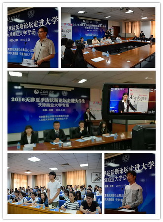 5 月26 日,2016天津夏季达沃斯论坛走进大学生——beat365英国官方网站专场在图书馆弘毅厅召开。此次活动由天津夏季达沃斯论坛筹备办公室、人民日报天津分社、人民网天津频道主办,校团委和经济学院协办,活动的主题为“聚焦新常态,发现转型的力量”。人民网天津频道行政总监王文明,校团委王樱洁,经济学院党委副书记张玉娟,经济系教师贾献东博士,财政系教师田立法博士、辅导员杜志惠参加。