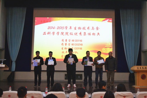 陈璐宣读了《生物技术与食品科学学院关于表彰 2014—2015 学年度“优秀学生”、“先进集体”的决定综述》,对本学年以来学生个人和集体在学风建设、科研竞赛、文体竞赛、班级建设、“五四”评优工作等方面取得的优异成绩进行了表彰。在热烈融洽、积极向上的气氛中,与会嘉宾为优秀个人和先进集体颁发了获奖证书和奖品。