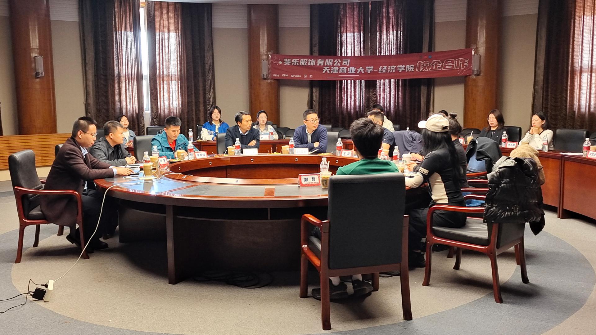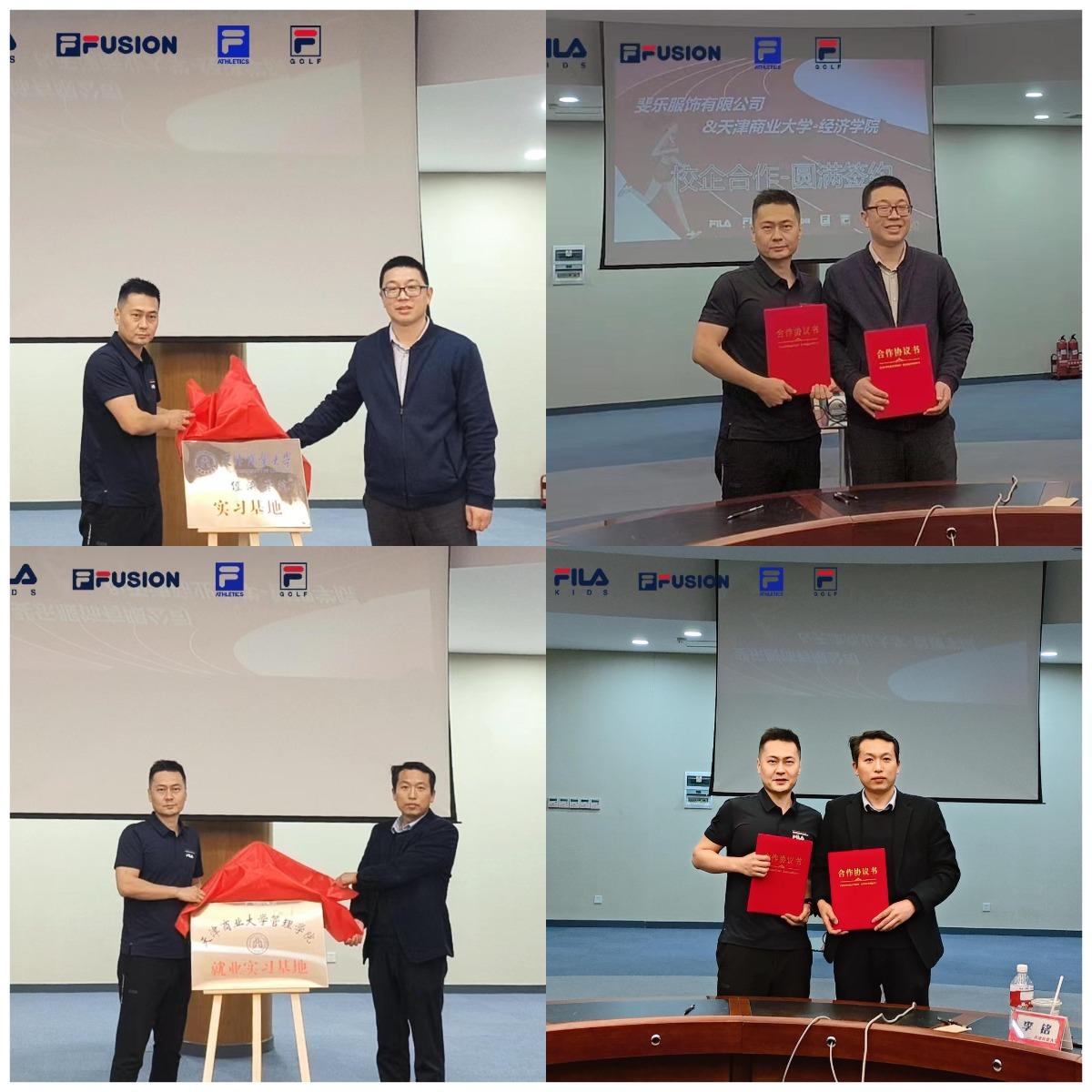 代丽平首先带领大家参观了斐乐天津新燕莎奥特莱斯店区,介绍了斐乐企业文化。随后,校企双方召开座谈交流会。赵立彬、刘宁介绍了经济学院、管理学院的发展历程,专业设置和办学规模等情况。王晶介绍了公司的主营业务、发展愿景和人才需求,希望能够吸纳更多锐意进取的天商学子,促进企业高质量发展。米薇深入介绍了校企合作项目书,着重讲解了“斐凡生”人才战略规划。会后,校企双方签署合作协议书,并进行实习就业基地揭牌仪式。