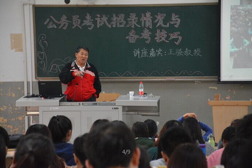 10 月16 日下午,公共管理学院邀请到公务员考试研究专家、南开大学周恩来政府管理学院王骚教授为同学们做《公务员考试招录情况与备考技巧》主题讲座。行政管理系教师代表、行政管理系2013 级全体同学及公共管理学院应届本科生、研究生参加讲座。