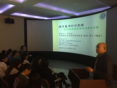 随后,王庆生作了题为《读万卷书,行万里路》的讲座,细致地阐述了作为国内知名旅游学者对旅游的认识,以及旅游活动对健全人格、陶冶情操、感悟人生和精修学业的重要意义和价值,并通过丰富的阅历和精彩的旅游实践资料,使旅游管理类 2015 级新生对所学专业产生了浓厚的兴趣和求学欲望。