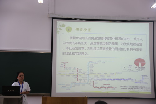 9 月19 日上午,项目组成员 2012 级统计学专业的陈丽珍、 田晓莉两位同学代表项目组在年会经济组学术论文答辩会上向与会专家及参赛高校师生结合其项目 “ 天津市地铁运营客流量统计预测与调度优化设计 ” (项目编号: 201310069014 ) 研究成果 《 城市轨道交通客流量预测的信度模型及其应用 》一文 做了详细介绍,并就专家组提问做了精彩回答,受到评委专家一致好评。当日下午入选项目高校通过电脑或手机 web 对参赛项目进行现场投票,评选出本届年会优秀项目。