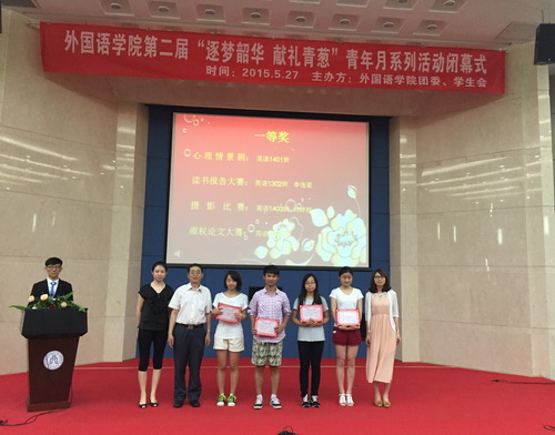 5 月 27 日下午,以 “ 逐梦韶华 献礼青葱 ” 为主题的外国语学院第二届“青年月”系列活动闭幕式暨班级成果展示大赛在图书馆三楼国际报告厅圆满结束。外国语学院副院长王永祥、党委副书记骆媛、日语系主任荆红艳、辅导员马静、郭文雅等老师应邀出席,各级学生组织学生干部以及全体 2014 级学生参加。