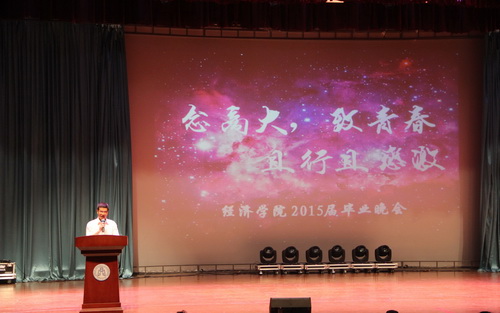 6 月 16 日下午,“念商大·致青春,且行且感激”——经济学院 2015 届毕业晚会在科学会堂成功举办。经济学院院长刘小军、院党委副书记张玉娟、副院长王常栢、副院长巫建国、金融系主任刘红霞、经济系主任李海伟、财政系主任粱学平、毕业班班主任及各系辅导员出席了晚会。老师们和毕业生们汇聚一堂,共同观看了本次晚会。