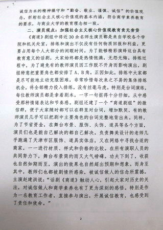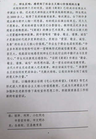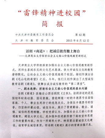 近日,天津市委教育工委、天津市教委以“话剧《商道》:把诚信教育搬上舞台”为题编发简报,介绍beat365官网师生创作演出话剧《商道》,用戏剧的形式开展诚信教育的过程及效果。《简报》称,这是beat365官网探索社会主义核心价值观教育新形式。