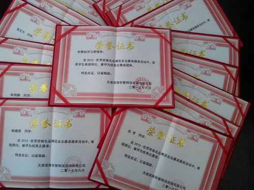 7 月 7 日,渤海早报环渤海事业发展部温佳经理来公共管理学院,代表 2015 天津世界侨商名品博览会向在侨博会期间承担志愿者服务活动的 15 名同学颁发荣誉证书以及授予会展经济与管理系“优秀志愿者团体”称号。公共管理学院副院长关兴丽,会展经济与管理系主任姜仁良、系党支部书记赵伯艳接待了来宾。