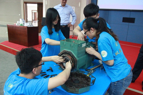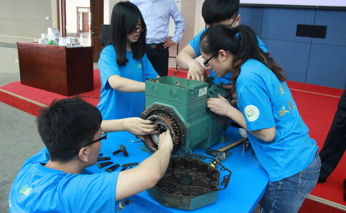 活动开始,周学连在致辞中鼓励同学们将理论和实际相结合,丰富专业知识,提高动手能力。王玉成为同学们讲解了关于制冷压缩机的相关知识,让大家对压缩机有了更深入的了解。卞栋栋向同学们介绍了路伟公司的产业规模、发展方向及产品。此次竞赛共分为知识竞答和实操组装两个环节,经过激烈角逐, 12 级热能班代表队获得胜利,两队在比赛过程中体现出的较强的动手能力、娴熟的专业技能、深厚的专业功底都赢得了现场观众与企业嘉宾的阵阵掌声。