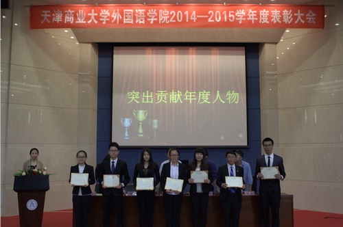 王永祥在致辞中,对受表彰的同学表示诚挚的祝贺,向一年来推动外国语学院不断向前发展的老师和同学表示由衷的感谢。他公布了今年学院毕业生取得的可喜成绩,共有 21 位同学了考取国内外众多知名大学的硕士研究生。他希望能借此鼓励同学们将人生目标作为内在动力不断激励自己,面对困境要勇于突破、直面竞争。同时,也希望老师们能够继续加强对课堂教学的研究,使教育科研和教育创新进一步向更深层次推进。随后,骆媛宣读《外国语学院关于 2014-2015 学年度先进集体、优秀学生的表彰决定》。院系领导为获奖学生颁发证书并合影留念。本次大会共计颁发包括国家奖学金、天津市人民政府奖学金在内的各级各类荣誉 21 项,表彰优秀集体及个人687 人次。