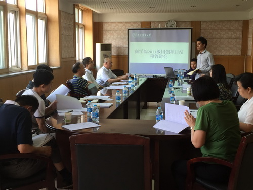 在教务处统一工作部署下, 5 月 22 日下午,商学院 2011 级国家级大创项目结项答辩会在会议室举行。教务处副处长郭景旺、教务处实习科科长纪多多、商学院副院长王庆生、答辩评委、项目指导教师及项目组成员参加了此次答辩会。