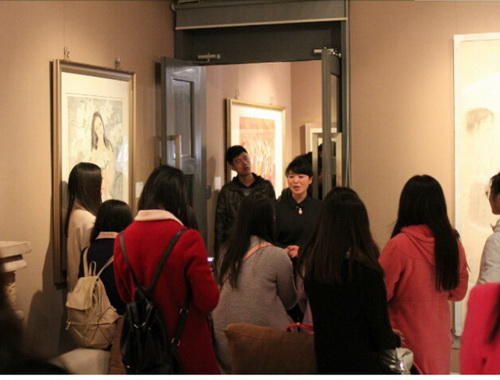 紧接着穿过睦南道名人旧居,来到了鼎天美术公馆进行学习与参观,本次在馆内布展的是于栋华人物作品展,于栋华现为天津大学工笔重彩研究所工笔重彩研究方向博士。 2000 年作品 《 鸡冠花 》 在首届中国美术金彩奖作品展中入选并被中国美术馆收藏; 2002 年作品 《 金秋 》在山东省庆祝建党 80 周年作品展中获得三等奖,在全国第五届工笔画大展中获优秀奖,并被中国美术馆收藏。 此次画展主要以工笔人物为主,并邀请馆内讲解人员对布展和艺术家的创作思路、创作风格做了详细的介绍,师生认真聆听讲解员的精彩讲述,认真参观并做记录。