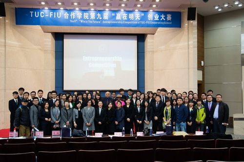4 月 12 日 下午,由酒管学社主办的 TUC-FIU 合作学院第九届“赢在明天”创业大赛决赛在图书馆三楼国际报告厅举行。