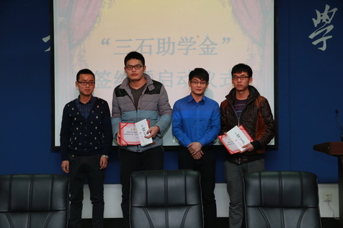 王俊和余水两位校友是公共管理学院行政管理专业毕业生。毕业后,两人通过贷款及良好的大学生创业政策加盟兰州食品品牌“宝升福”,在传统面食的基础进行了丰富和优化,目前已经成功经营两家店面,占地面积 300 多平方米,吸纳就业 20 人,其中本科及以上学历 5 人。创业初见成效后,两位校友为了回馈母校,决定在公共管理学院行政管理专业设立“三石助学金”,旨在帮助积极进取、生活上有困难的学生顺利完成学业。“三石助学金”面向行政管理专业大三学生,每学年共资助 6 人 , 资助金额总计 16000 元。其中,设立一等助学金 1 人,资助金额为 4000 元 / 人;二等助学金 2 人,资助金额为 3000 元 / 人;三等助学金 3 人,资助金额为 2000 元 / 人。“三石助学金”评选工作是由公共管理学院根据评选细则,按照 1 : 2 的比例,在坚持公开、公正、公平原则的前提下,从行政管理专业大三学生中遴选 12 名候选人,推荐给资助方,最终由资助方确定 6 名受资助对象。经过初选和复选两个环节,行政管理 1201 班的蔡林冬等 6 位同学成为“三石助学金”的首批受益者。beat365英国官方网站校友会办公室张堃主任、“三石助学金”设立者王俊和余水两位校友、公共管理学院刘均玲副书记分别为获得一、二、三等“三石助学金”的同学颁发证书和奖金。获奖学生代表蔡林冬代表受资助的 6 名同学发言,对两位学长的支持表示衷心地感谢,并向学长和学院表示,一定继续努力学习,全面提升个人综合素养,争取用更好的成绩回馈学长的支持,将来也要向两位优秀学长那样,懂得感恩,回馈母校。最后,校友会办公室张堃主任做了总结发言,对两位校友的创业经历给予高度评价,并对两位校友创业成功后回馈母校的善举表示衷心地感谢,同时他还勉励在校学生要以优秀校友为楷模,时刻怀揣感恩之心,做一个对国家和社会有益的人才。