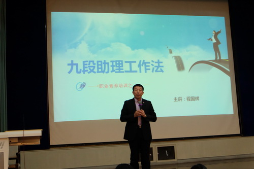 知名企业内训师、国家一级人力资源管理师程国辉在“社团梦,我的梦之材优干济”培训模块中,以《九段助理工作法》为题, 分别对九个级别助理的工作方法进行了逐层讲解,分析作为一名学生干部应有的素质,不断完善自己,切实提高工作能力和工作效率,更好地为同学服务,实现自我的价值。